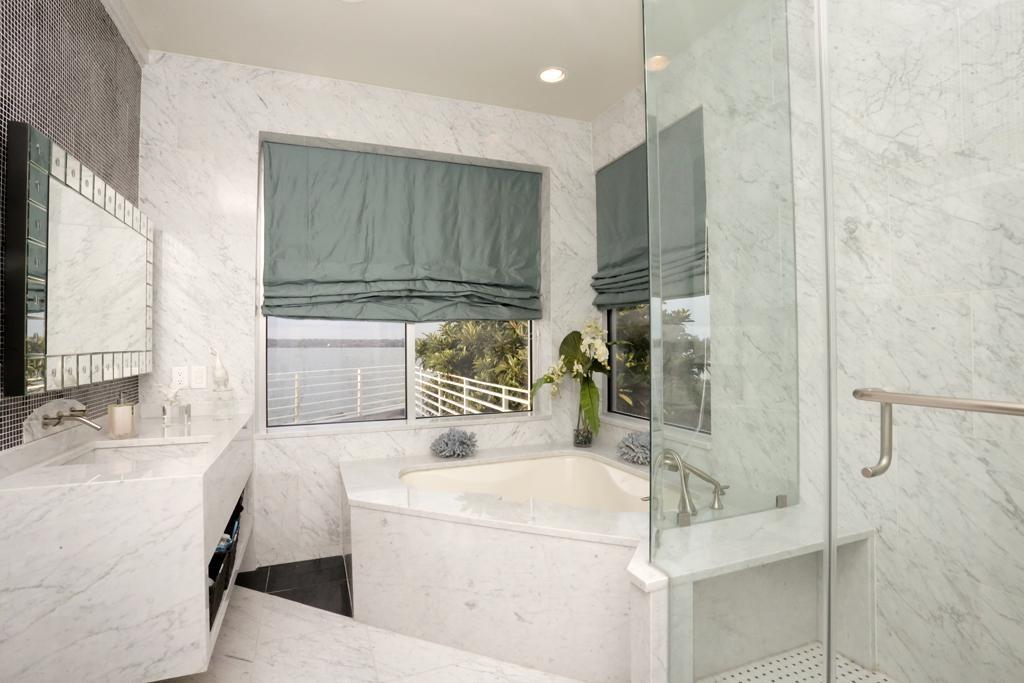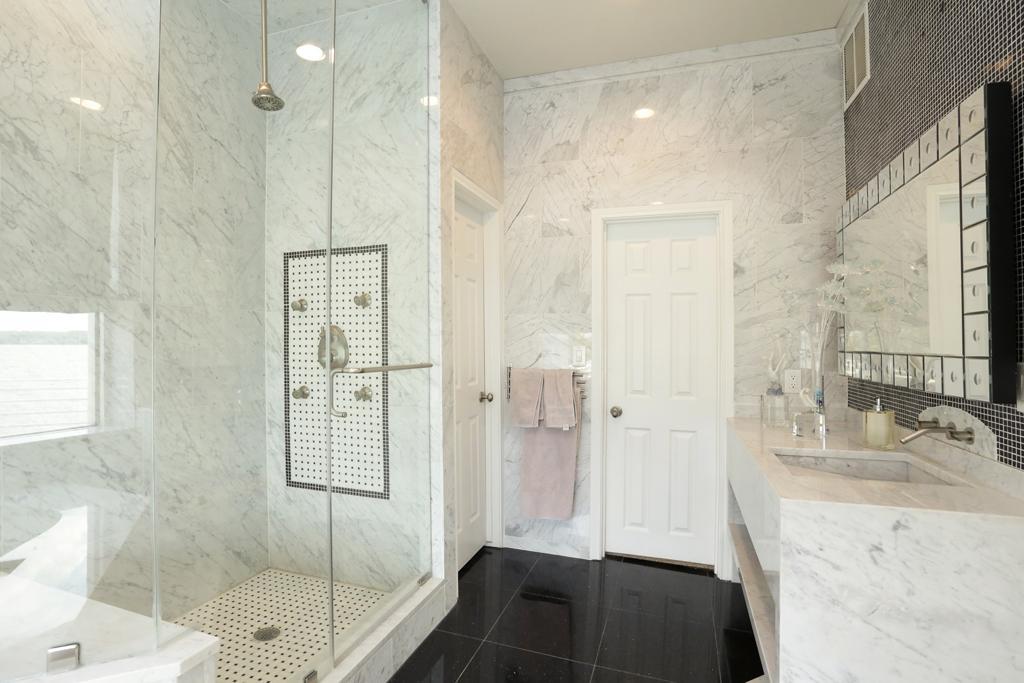 Этим камнем облицованы стены всего помещения, а также пол в душевой кабине (собранный из маленьких мозаичных квадратов). Этим мрамором отделаны тумба с встроенной раковиной и массивный постамент для ванны. Из него изготовлена скамья в душевой кабине и миниатюрные подоконники.