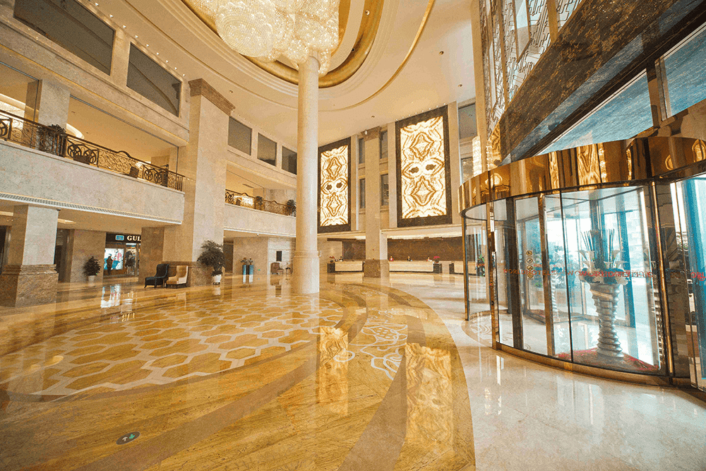 Пол фойе выложен в виде огромного панно из трех сортов мрамора: яркого желтого Amarillo Triana, светло-коричневого Brecha Rosada и бежевого Crema Marfil.