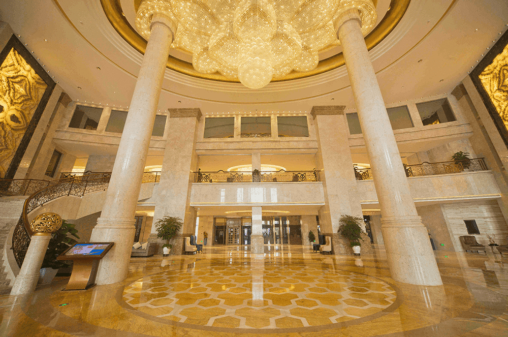 Стены фойе на уровне второго и третьего этажей украшены четырьмя крупными подсвеченными панно из мраморного оникса. Плиты камня сложены раскладкой "бабочка" - они как бы "зеркалят" друг друга. Использован сорт оникса Miele. Ярко-желтые слэбы толщиной 20 мм отлично пропускают свет встроенных внутри панно свето-диодов. Панно из оникса обрамлено рамой из экстравагантного золотисто-черного мрамора Black and Gold (китайский аналог итальянского мрамора Nero Portoro).