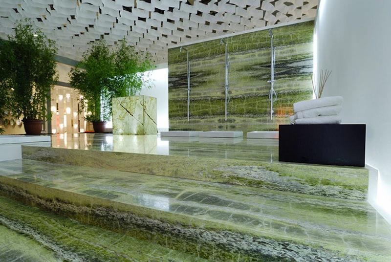 Если бы не главный материал - серпентинит Irish Green, проект произвел бы весьма посредственное впечатление. Но именно этот камень завершает, освежает и декорирует все пространство. Камень заряжает помещение и не требует дополнительных изысков. Irish Green - это весьма самодостаточный камень, который в одиночку способен держать на себе всю стилистическую идеологию проекта.