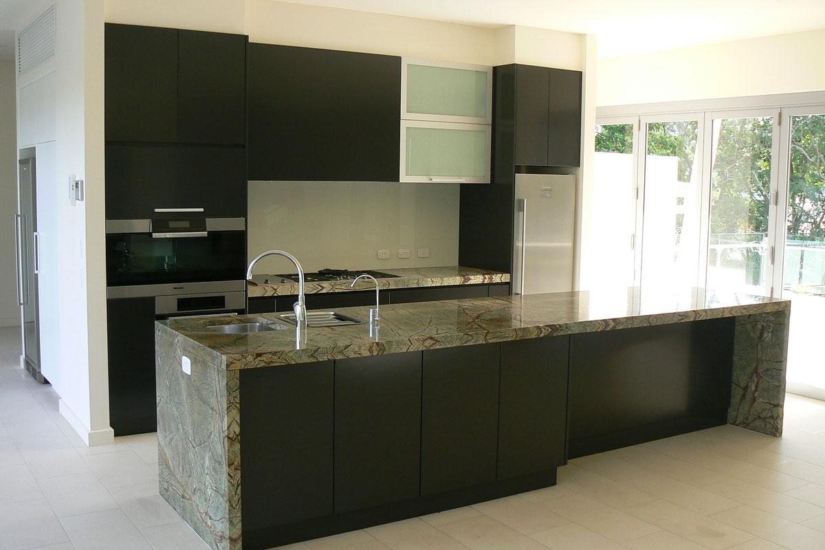 На этой современной кухне Rainforest Green служит материалом для столешниц: рабочей зоны у варки и модного стола-острова П-образной формы.