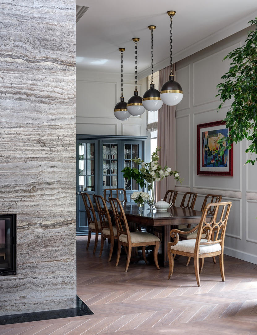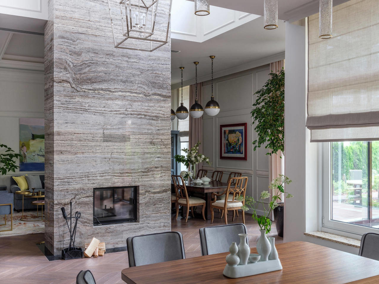 В данном проекте каминный портал представляет собой прямоугольную крупную колонну, уходящую ввысь до самого стеклянного купола в потолке дома. Сооружение кажется одновременно величественным и элегантным.