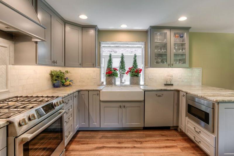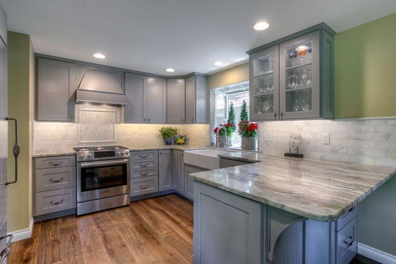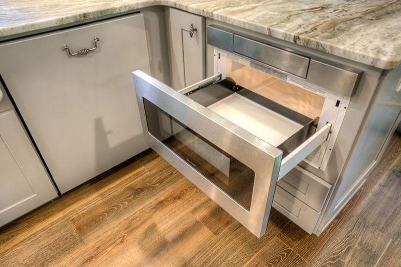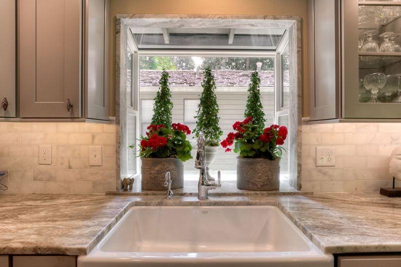 Для покрытия рабочих поверхностей был выбран серый травертин Travertine Silver с полосчатым рисунком (распиловка вдоль жилы - Vein Cut). Все столешницы вырезаны из 3-сантиметровых слэбов травертина с полированной фактурой. Поверхность столешниц раскрывает удивительную волнистую текстуру камня в серо-бежевых тонах. Также этот камень слагает подоконник и оконную раму.