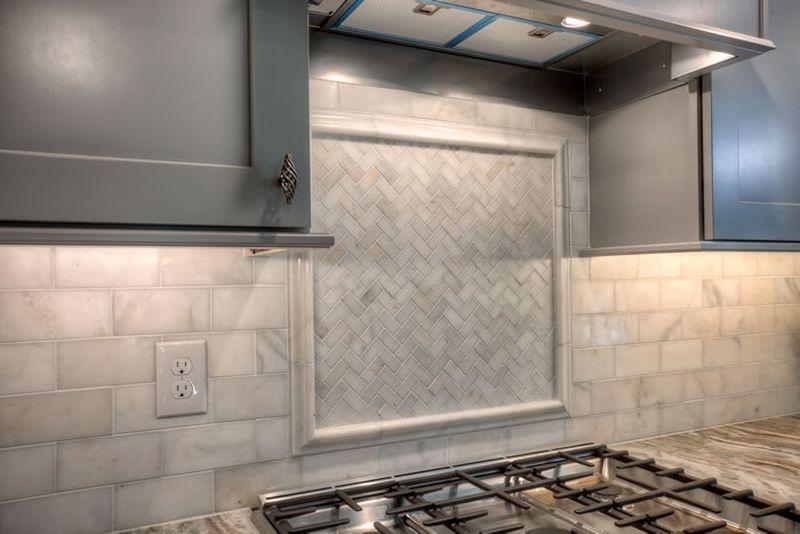 А вот зона фартука облицована мрамором, и мрамором не простым. А самым известным в мире - итальянским Bianco Carrara. Плитка светло-серого изысканного мрамора сложена в "кирпичную" кладку. У варочной поверхности фартук украшен фрагментом мозаики.