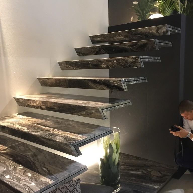 Подвесная лестница всегда смотрится удивительно и оригинально. Несмотря на развитие технологий и дизайна, ступени, будто зависшие в воздухе, создают сказочную атмосферу. Ко всему прочему, такая конструкция позволит заметно сэкономить пространство. А подвесные ступени из элегантного итальянского мрамора способны до неузнаваемости преобразить помещение.