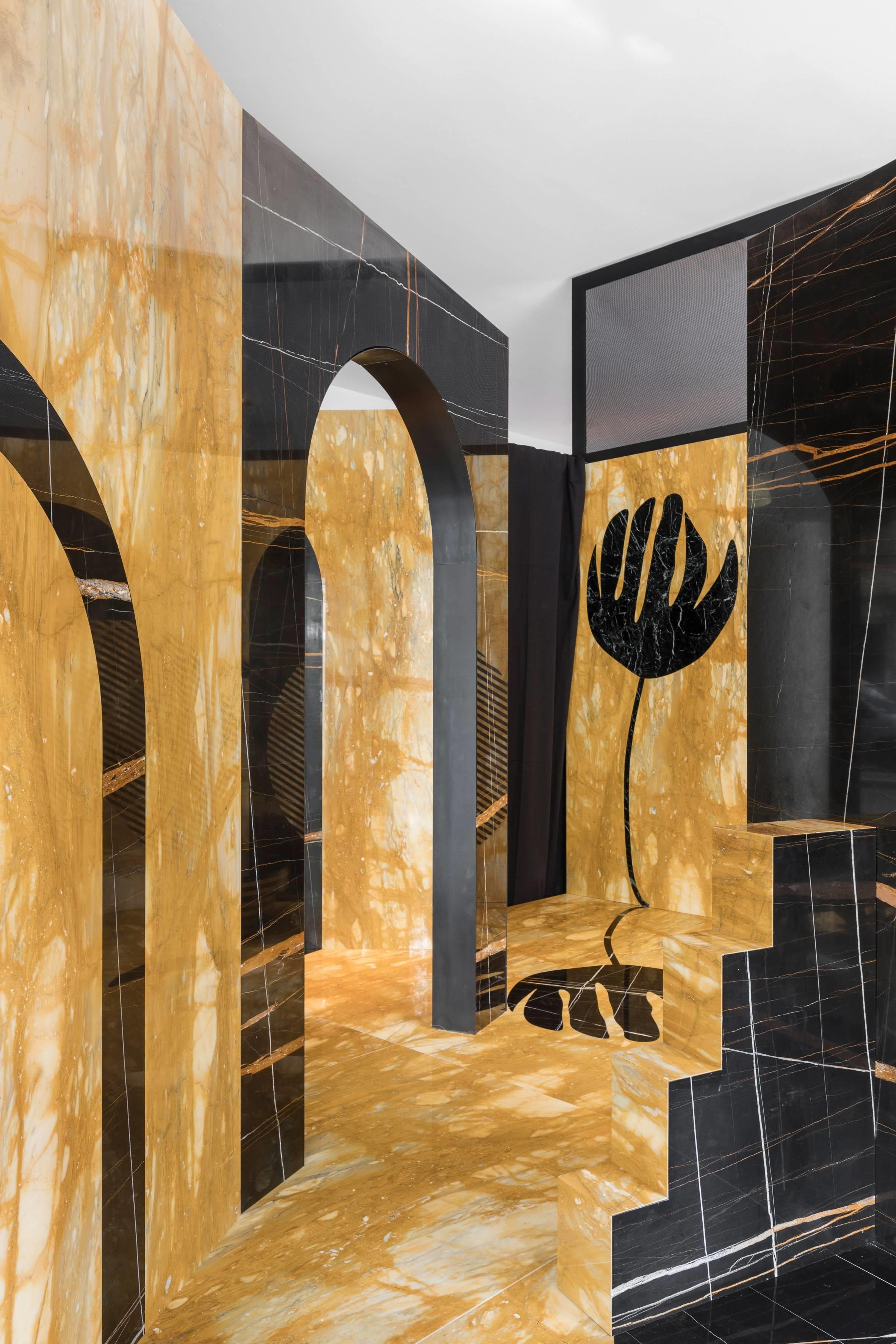 Дизайнеры стремились отвлечь гостей от шума выставки, погрузив их в мраморно-зазеркальный мир. Летиция и Маттэо прибегли к построению конструкции из элементов разных форм из желтого и черного камня. Крупные зеркала расширяют и без того сложное и наполненное пространство.