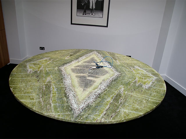 Круглая столешница вырезана из необыкновенного зеленого камня - ирландского серпентинита Irish Green. Поверхность стола собрана из четырех радиальных частей, которые формируют зеркальный рисунок, напоминающий калейдоскоп.