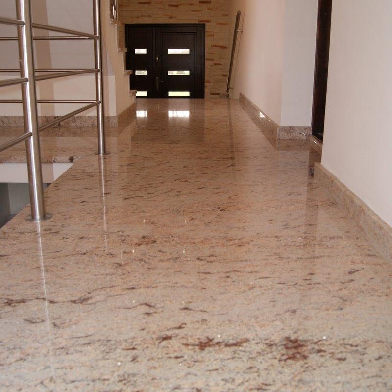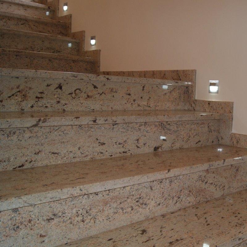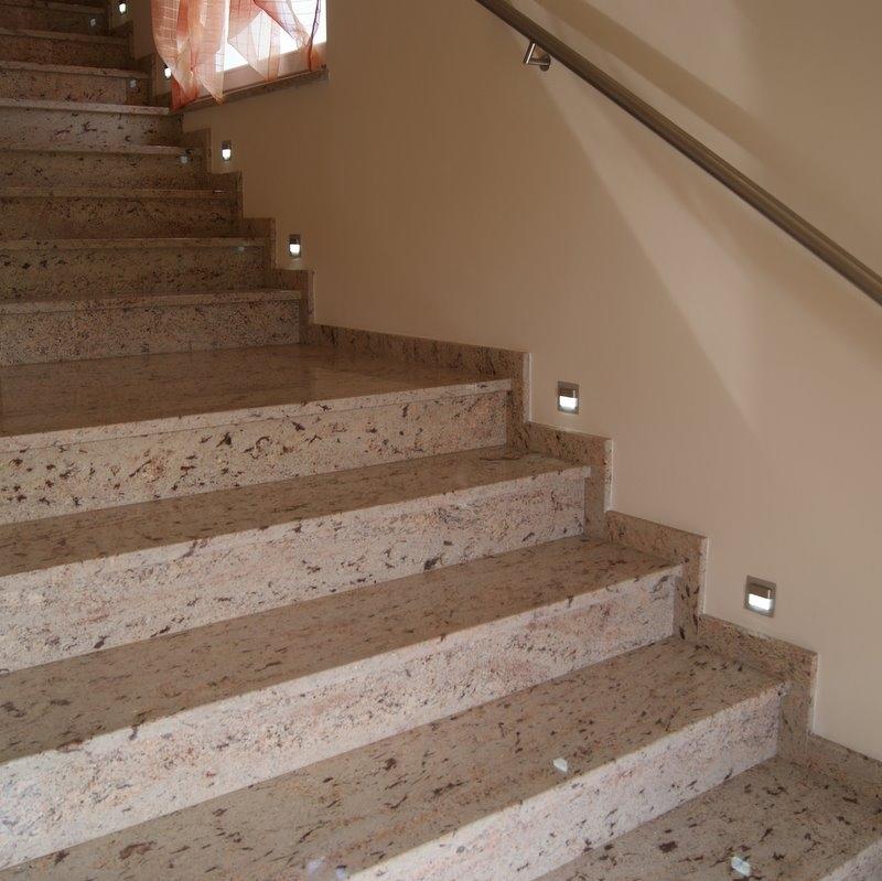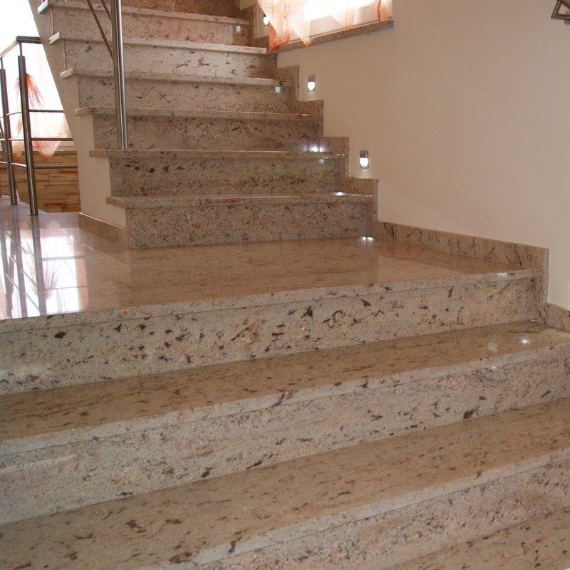Лестница в частном доме облицована полированным гранитом из Индии - Ivory Brown. Этот необычный камень обладает приятной для глаза текстурой - нежным тепло-бежевым цветом с розоватым отливом и полосчатым рисунком более темных минеральных вкраплений.
