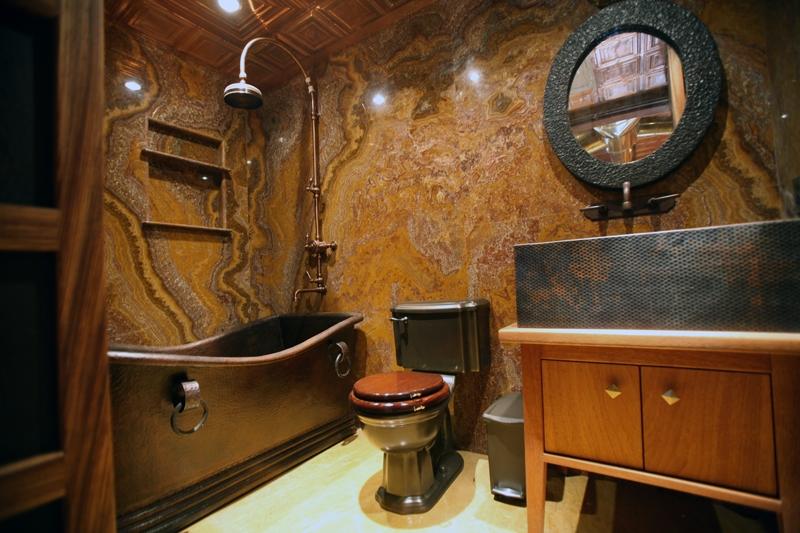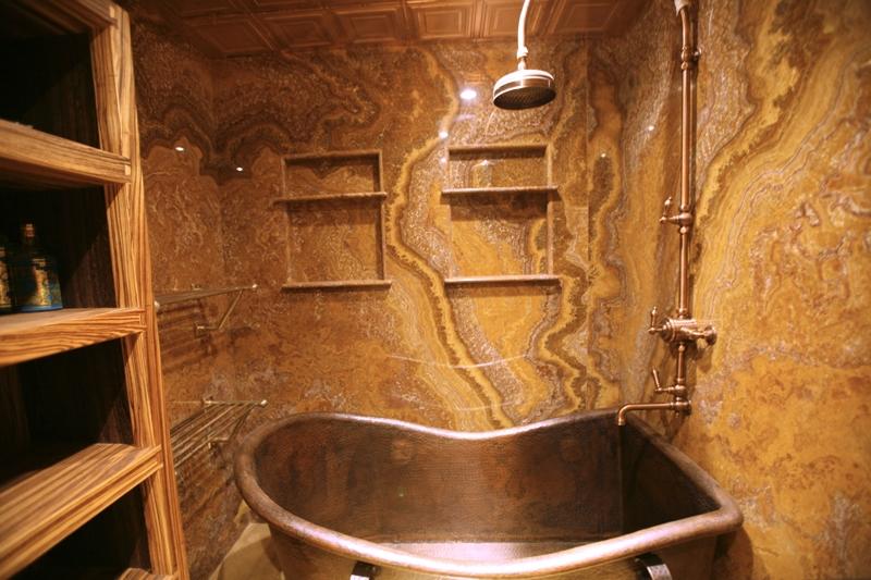 Перед нами весьма необычный проект ванной комнаты. Главным декоративным элементом пространства является мраморный оникс сорта Onyx Jasper. Он обладает выраженной узорчатой текстурой с прослойками красноватого, коричневого, желтого и оранжевого оттенков.