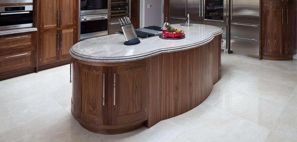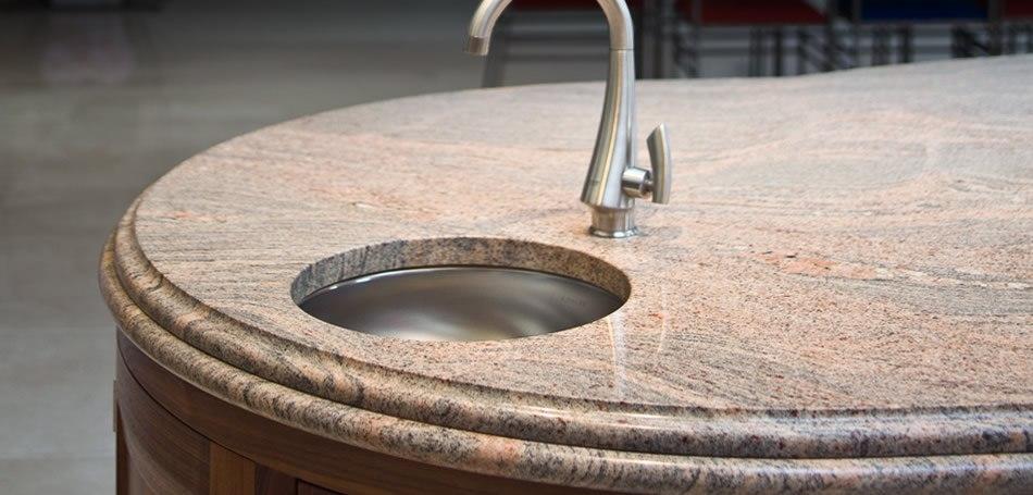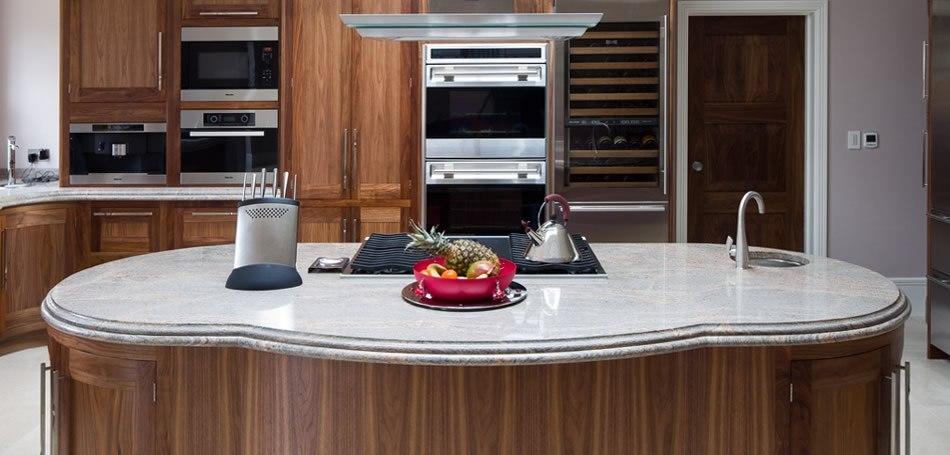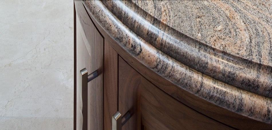 Кухонный остров и поверхности рабочей зоны покрыты столешницами из гранита Indian Juparana. Центральный остров особенно привлекает внимание - своей необычной формой и интересным торцевым профилем.