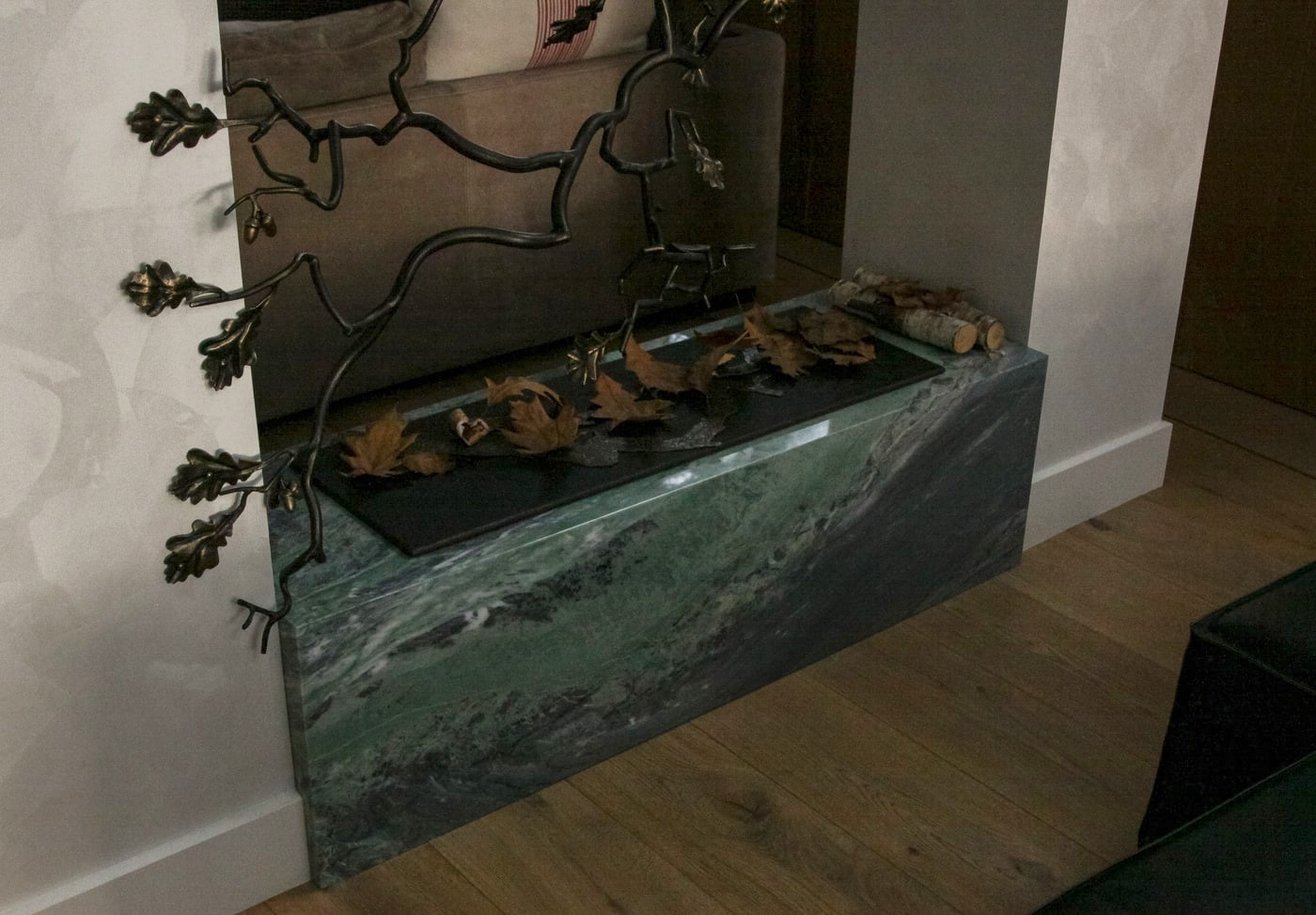 Детали облицовки были вырезаны из одного слэба таким образом, чтобы рисунок камня перетекал из одной плоскости в другую. Благодаря углам под 45° и мастерской финишной полировке, камин выглядит как цельный блок камня.