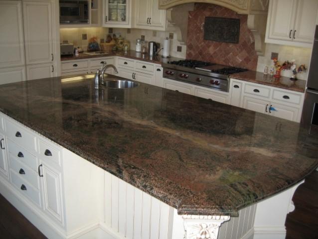 Из этого камня выполнена столешница для кухонного острова - поверхность выразительной формы с резным профилем, выполненная из единого слэба гранита. Фактура поверхности - полировка.