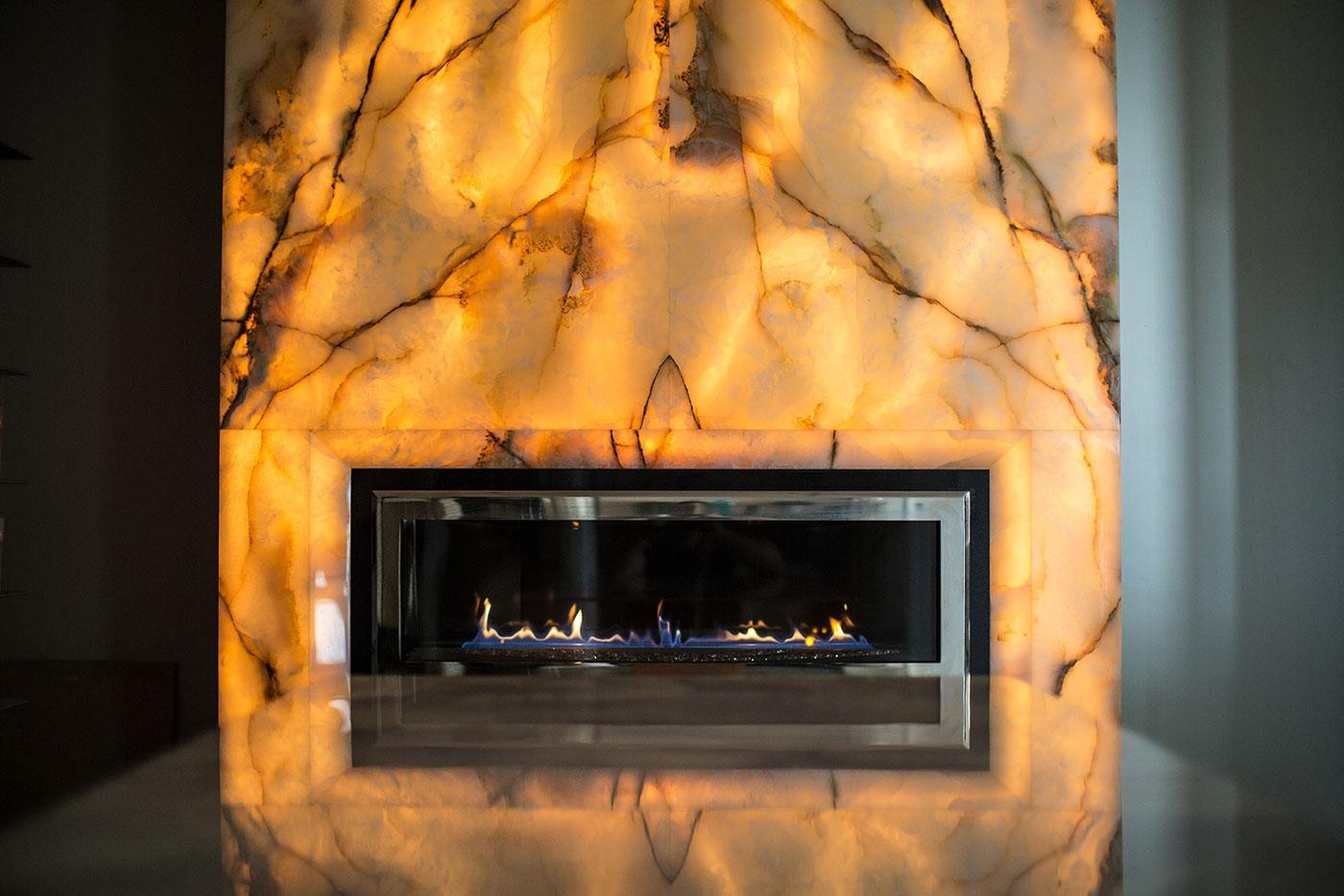 В этом каминном портале совмещены все модные интерьерные тенденции последних лет: крупные габариты каменного полотна, подсветка оникса, симметричный рисунок "бабочкой".