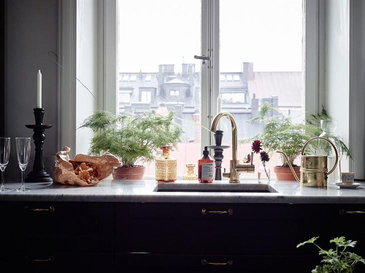 Столешницы и низкие фартуки этой кухни выполнены из легендарного, самого востребованного в мире мрамора — каррарской классики Bianco Carrara.