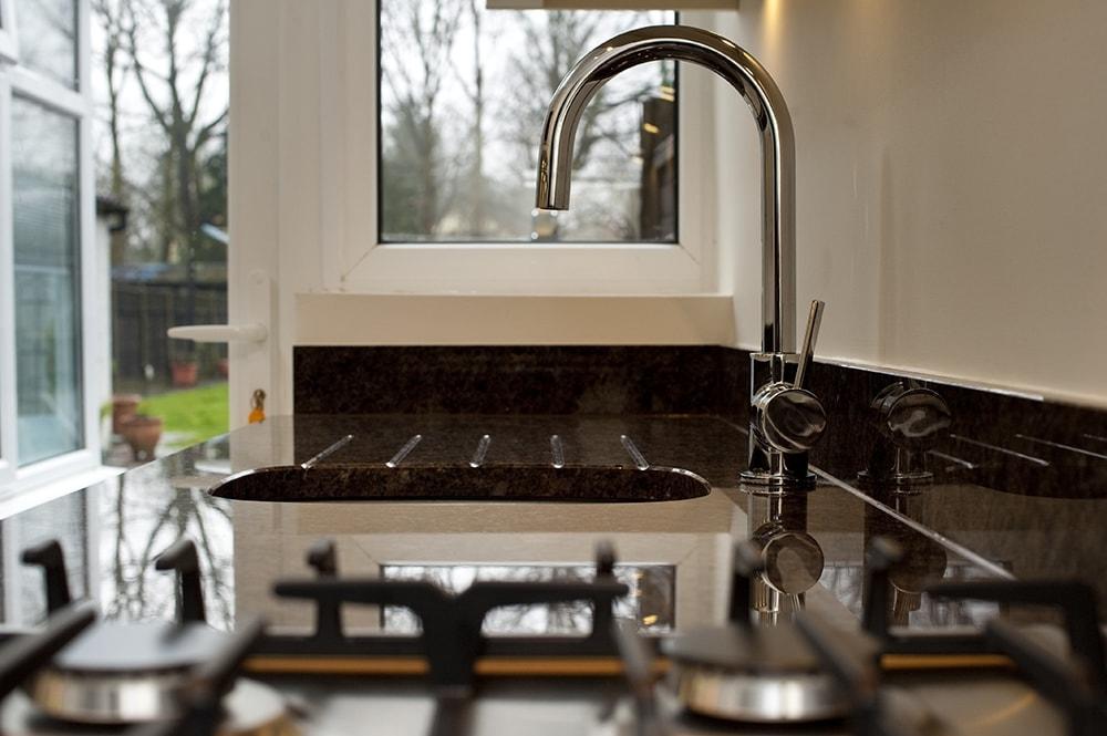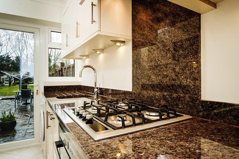 Для проекта были задействованы полированные слэбы толщиной 20 и 30 миллиметров - для отделки стены и фартука и для создания столешниц.