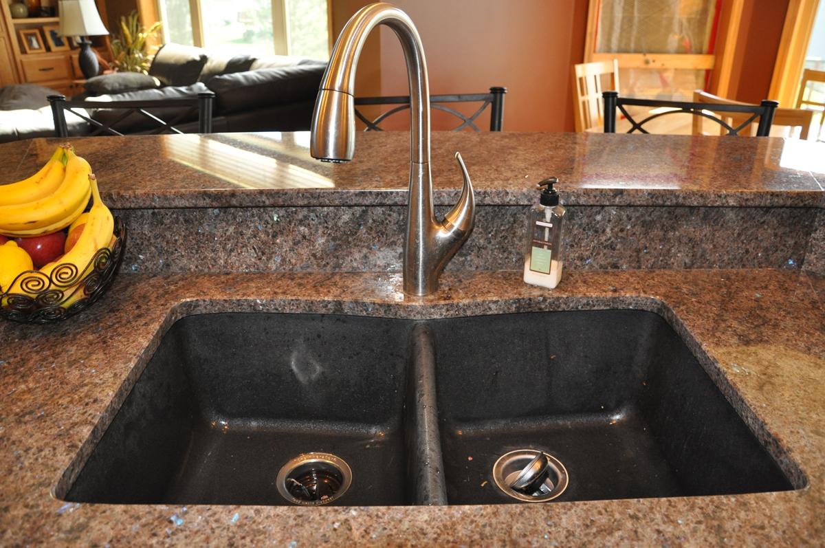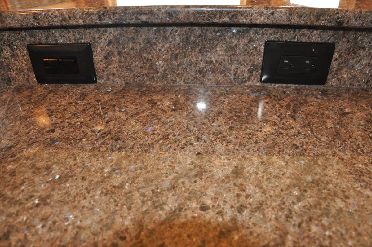 Столешницы рабочих поверхностей кухонного гарнитура, а также двух-ярусная барная стойка, покрыты камнем редкой красоты - Labrador Antique. Этот камень имеет среднезернистую структуру, основная масса тепло-коричневого оттенка вмещает в себя кристаллики с перламутровыми переливами. Это включения минерала лабрадора, который меняет оттенок при смене угла обзора или степени освещенности (этот эффект называется "иризация").