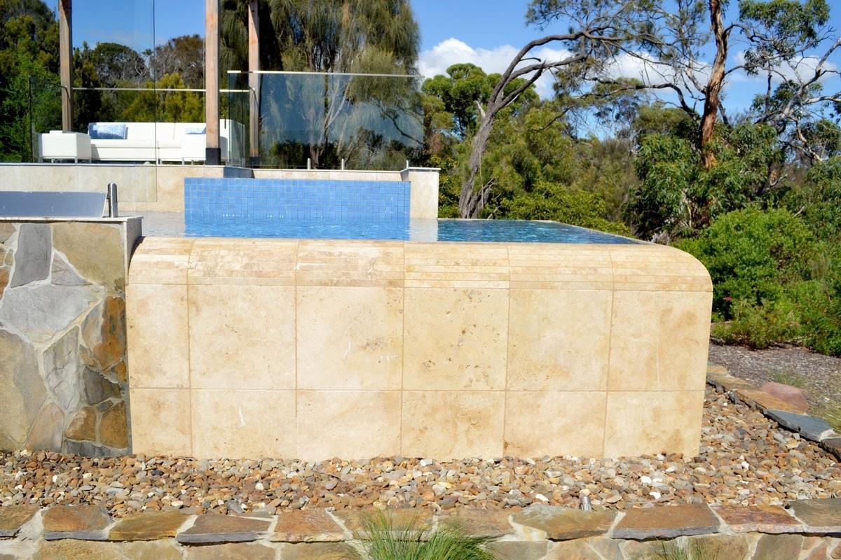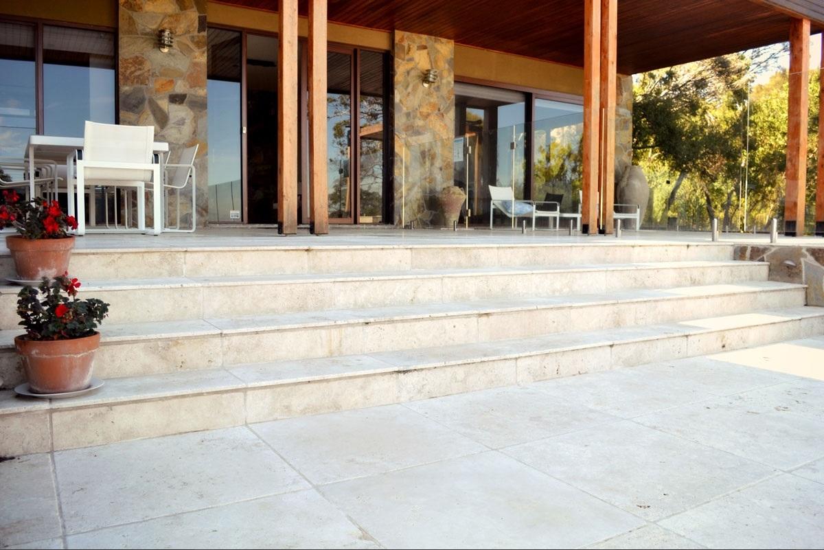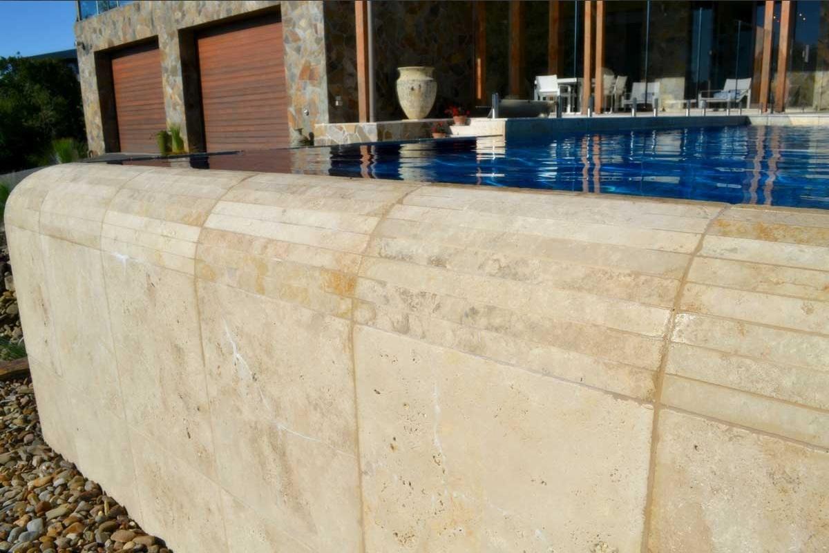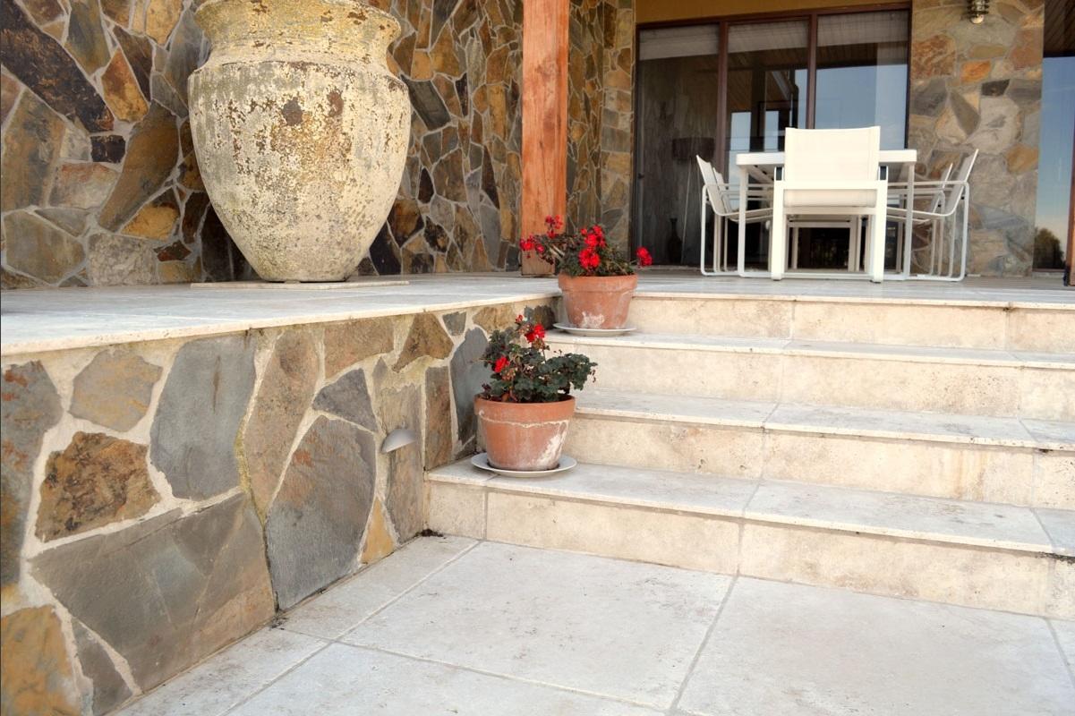 Плиты мощения, ступени лестницы, постамент для бассейна, пол в беседке - все это выполнено из светлого травертина Travertine Light. Светлый кремово-бежевый камень в лощеной обработке смотрится естественно и органично для окружающей среды. Пористый, теплый, шероховатый камень обладает минимальным скольжением, поэтому прекрасно подходит для отделки пространства вокруг бассейна.