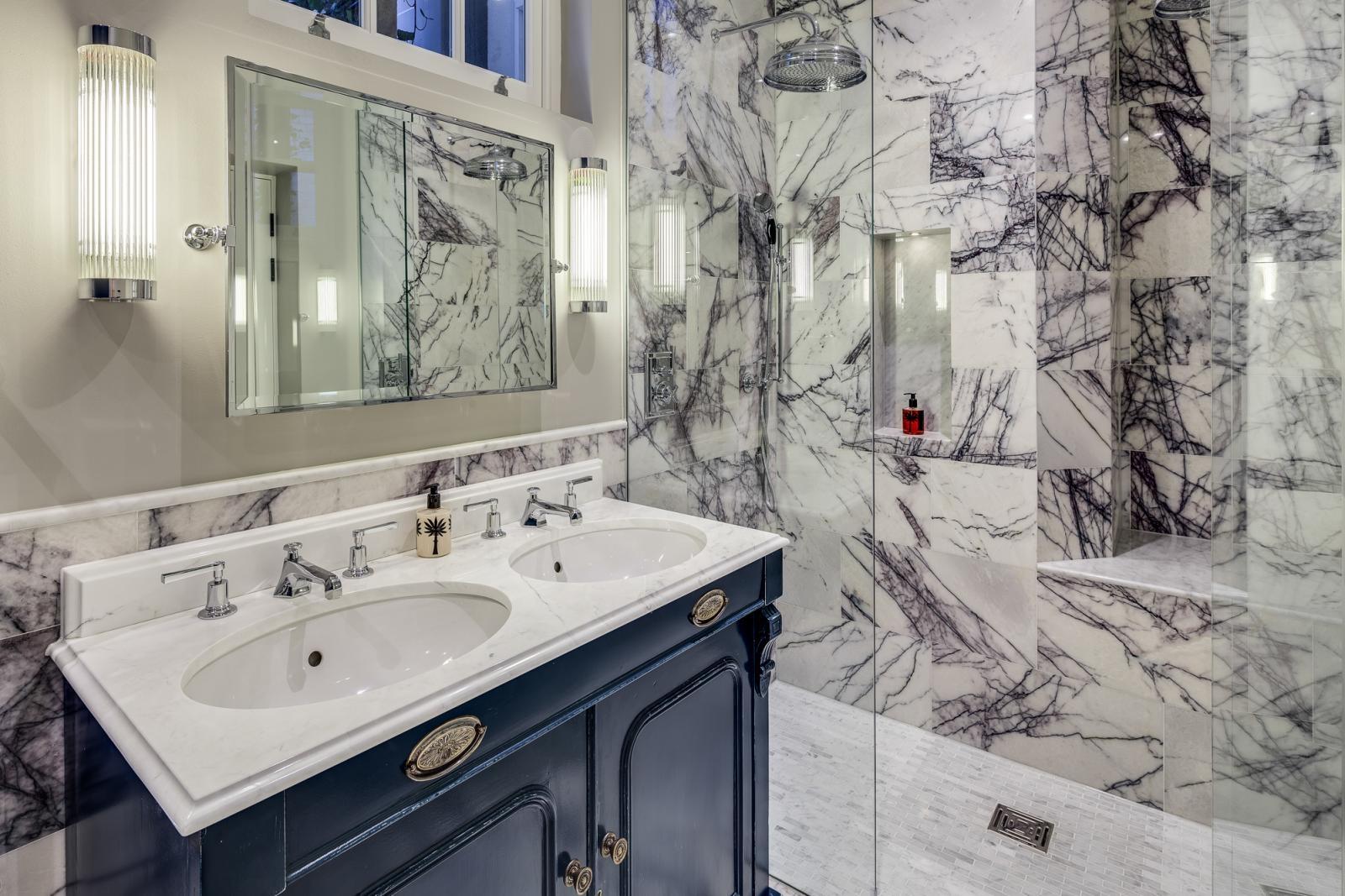 В интерьере также задействован каррарский мрамор высокого качества - Bianco Gioia. Из него вырезана столешница для раковин, украшенная сложным резным торцом. Им же облицован поддон в душевой кабине - в виде мозаики.