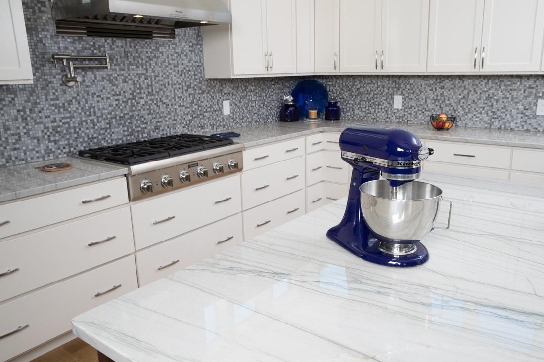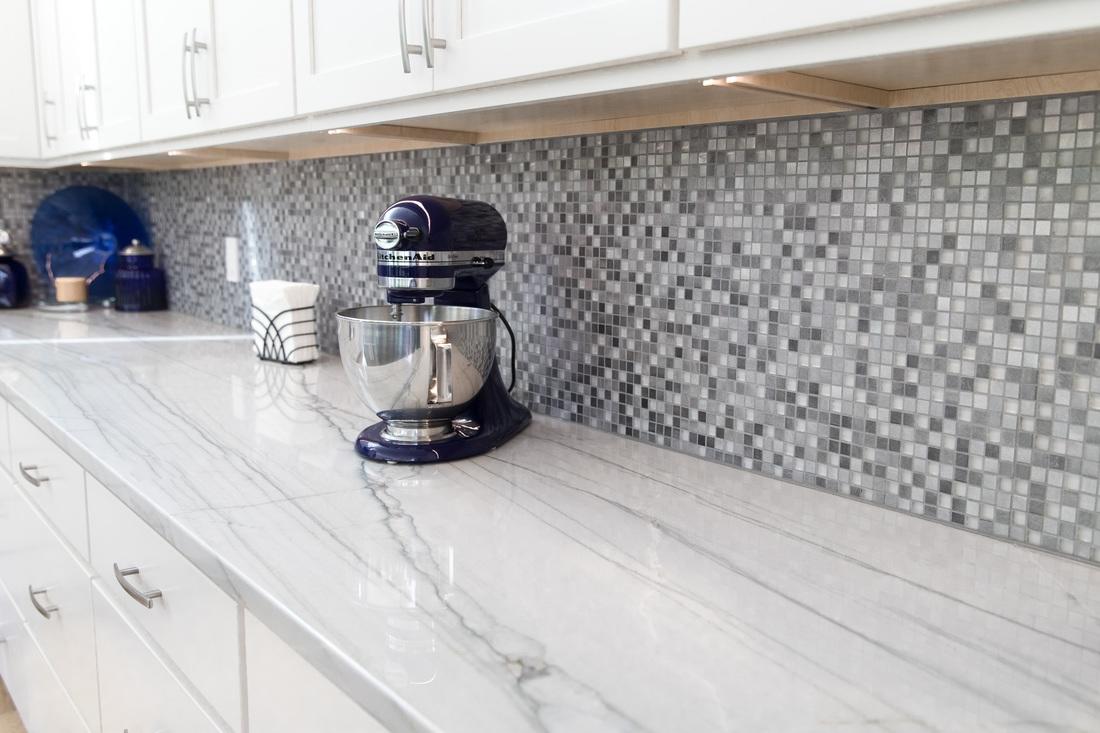 Для отделки рабочей зоны заказчик выбирал материал белого цвета. Сперва он остановил свой выбор на классическом белом мраморе с легким рисунком серых прожилок. Однако, выяснив высокий уровень загрузки на кухне (в доме будет жить большая семья), наши мастера посоветовали выбрать более устойчивый камень. Кварцит Bianco Macaubas - превосходный аналог мрамора. Он обладает белоснежным тоном и мелкозернистой структурой. Но у него есть одно весомое преимущество - его прочностные характеристики. Это очень плотный и твердый камень, состоящий из мельчайших кварцевых частиц (а кварц, как известно, один из самых прочных породообразующих минералов). Кварцит не вступает в реакцию с бытовыми и пищевыми кислотами. Его сложно поцарапать и почти невозможно оставить невыводимое пятно. В этом заключаются его главные отличия от мрамора.