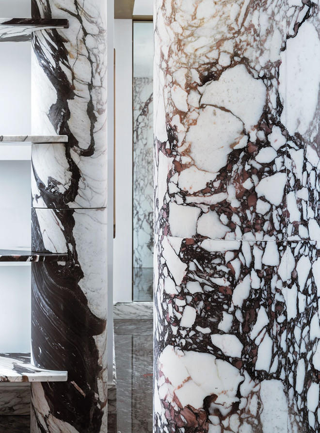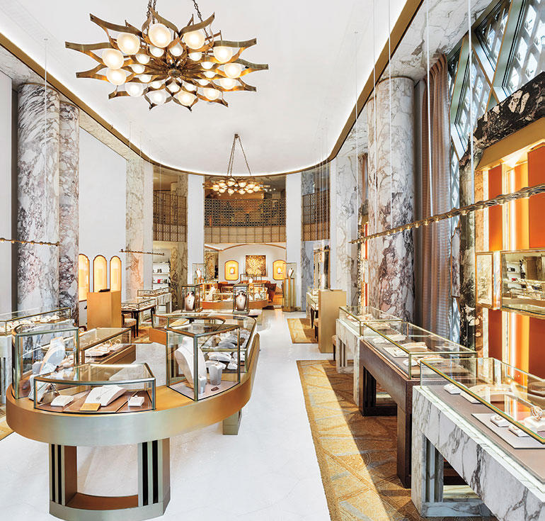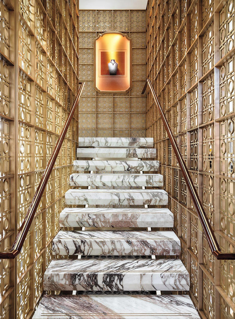 Для бутика архитектор выбрал сразу пять сортов итальянского мрамора. "Желтый, оранжевый, красный, — я никогда раньше не оформлял шоу-рум с использованием этих цветов". Ключевая особенность магазина — самые дорогостоящие ювелирные изделия не спрятаны в задних помещениях. Все объекты выставлены на показ гостям, посетителям и туристам.