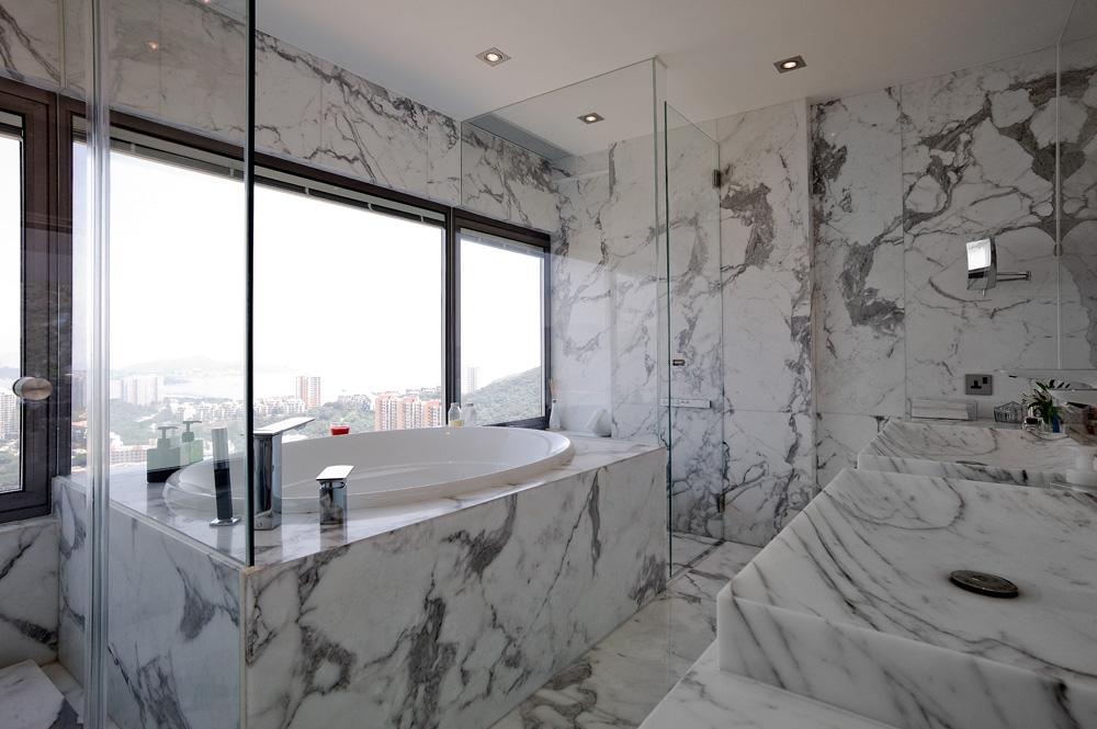Владелец аппартаментов по достоинству оценил утонченную красоту рисунка Bianco Statuario. Этот камень - единственное и самодостаточное украшение ванной. Он применялся повсеместно: отделка стен и пола, столешницы с раковинами и постамент для ванной.