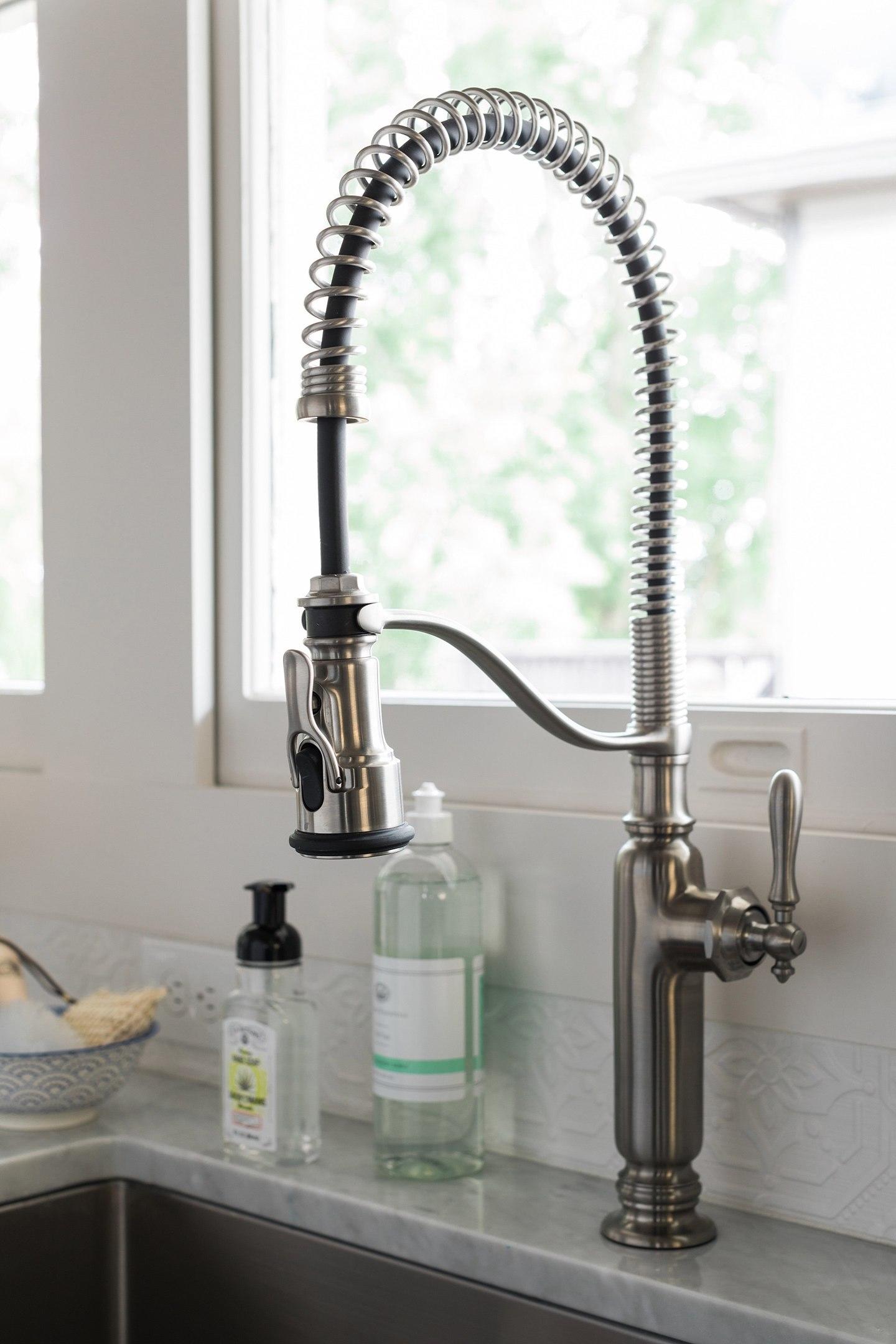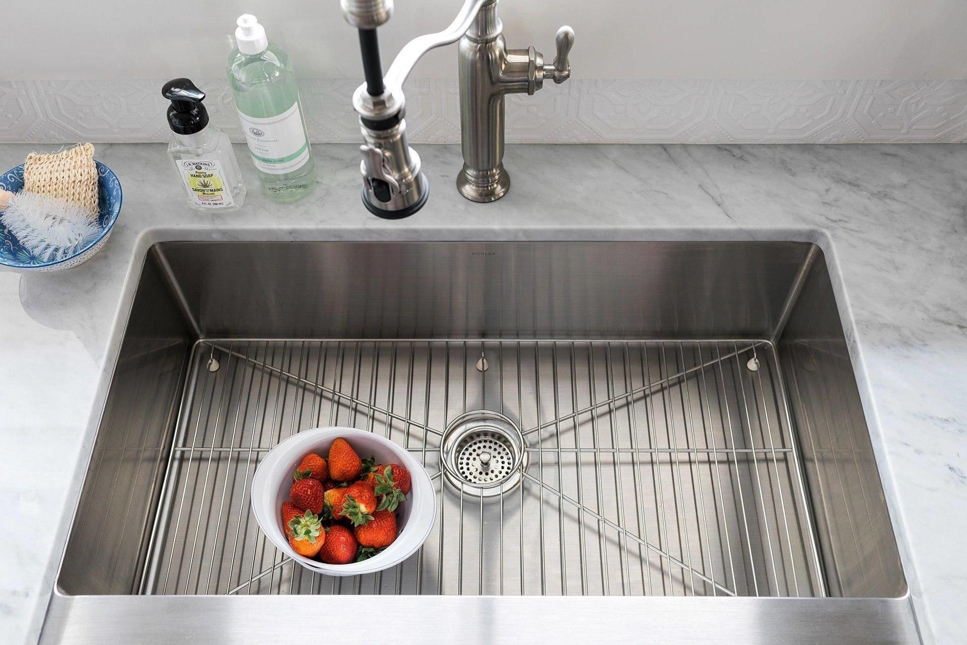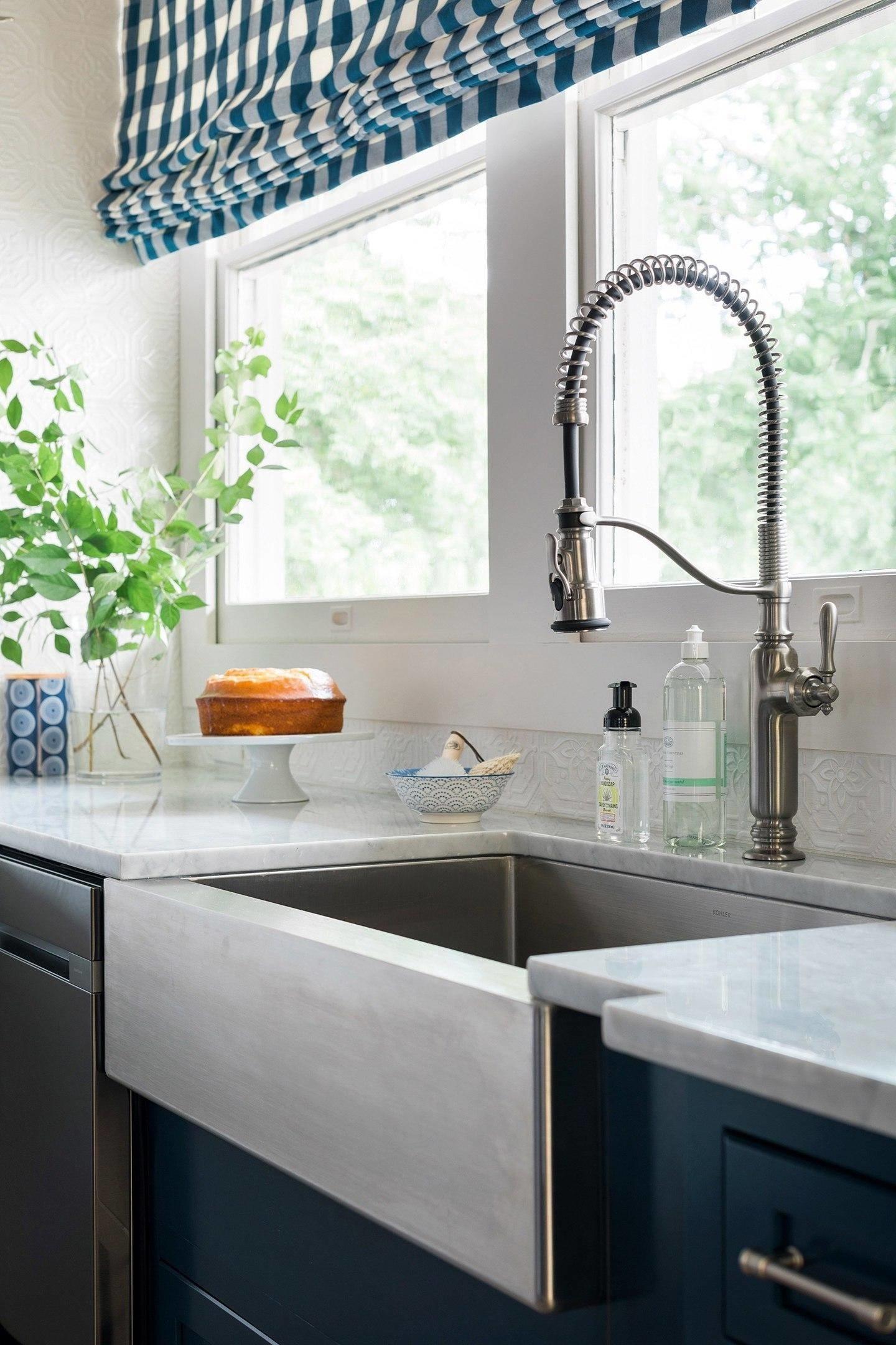 Кухонные рабочие зоны по периметру покрыты столешницами из классического каррарского мрамора Bianco Carrara. Этот камень обладает нежно-серым оттенком с аккуратным рисунком более темных прожилок. Этот чуткий, но весьма крепкий материал, способен прослужить долгие годы при бережном к себе отношении.