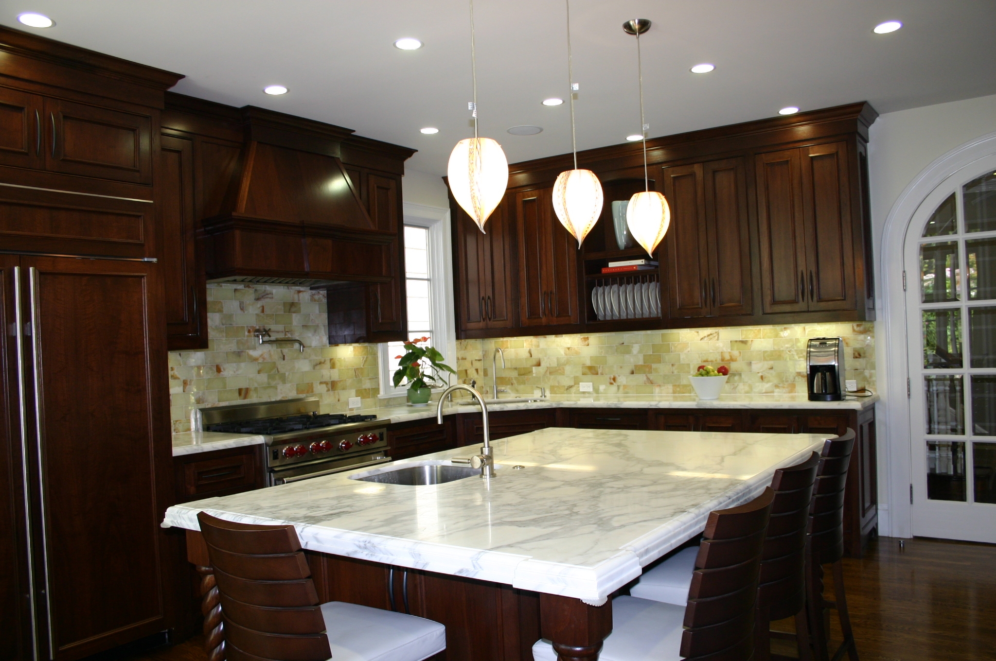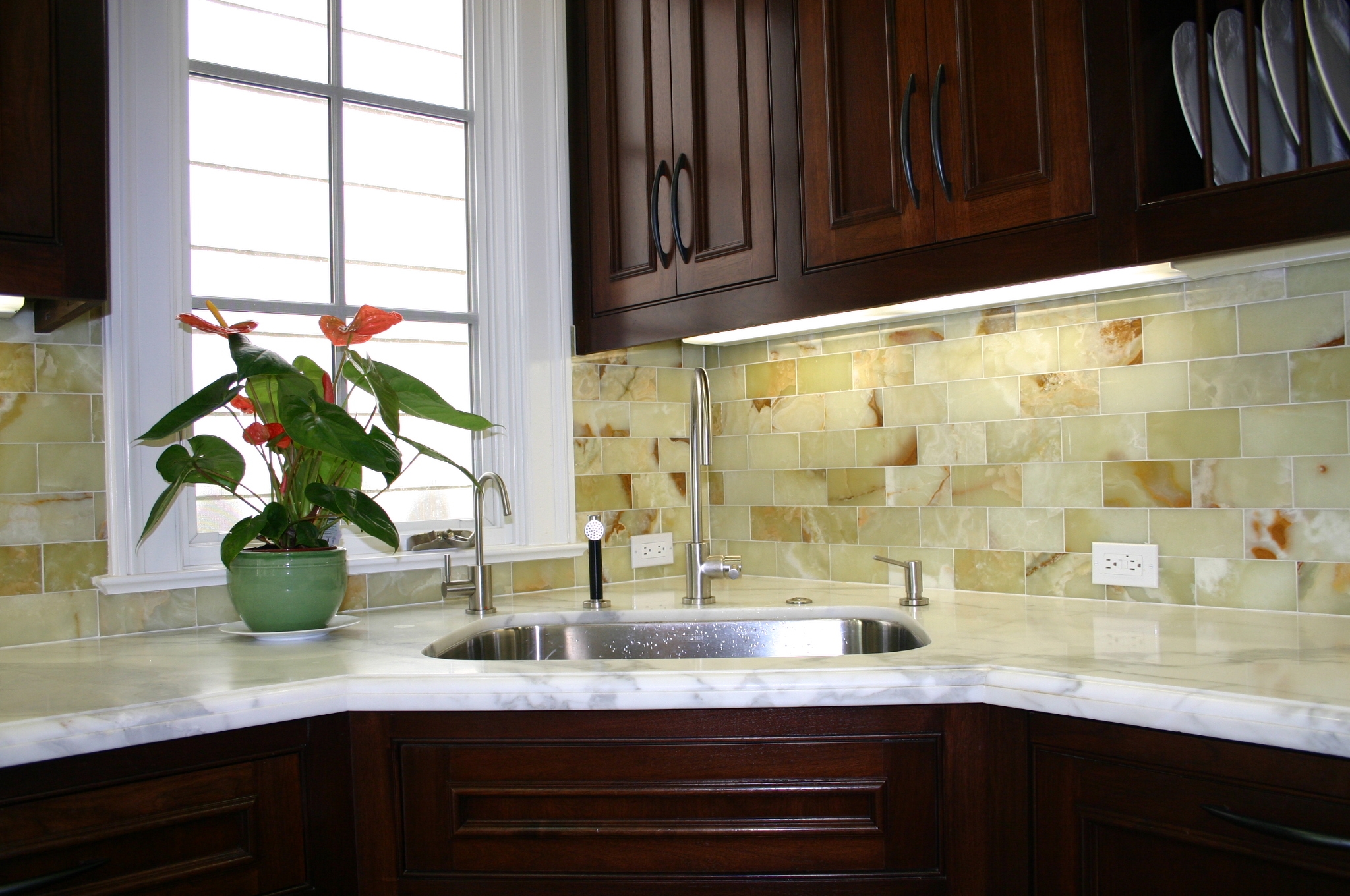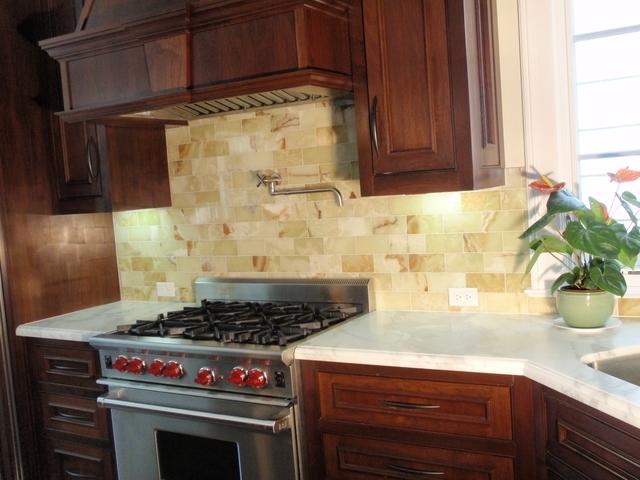 Особенно ярко и необычно смотрится кухонный фартук, облицованный плиткой мраморного оникса Pakistan Green. Тут использовалась редкая более светлая разновидность этого камня. Полированная тонкая плитка смотрится полупрозрачной, легко пропускающей свет, даже при наружных источниках освещения.