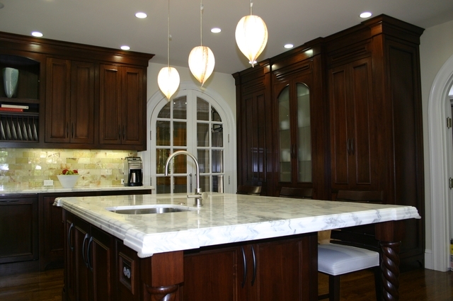 Все рабочие поверхности (и столешницы по периметру, и поверхность стола-острова) вырезаны из каррарского мрамора высокого качества - Bianco Gioia. Столешницы рабочих поверхностей вырезаны из крупных слэбов толщиной 3 сантиметра. Проектировщик стремился к минимальному количеству стыков. Столешница же стола-острова вырезана из нетипового толстомера (толщиной 5 сантиметра). Стол украшен сложным резным профилем, который придает этому массивному столу еще большую основательность и добротность.
