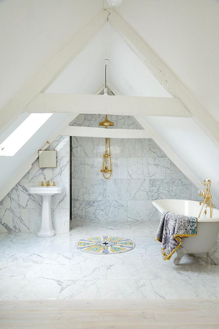Роскошная ванная комната в мраморе Volakas. Стены и полы выполнены из полированного греческого мрамора Volakas. Комната расположена на последнем этаже в помещении мансарды. Мы видим удивительное стилистическое решение: повсеместная облицовка белоснежным мрамором в «чердачном» пространстве! Оказывается, дорогой греческий мрамор, золотистая сантехника и деревянные потолочные балки прекрасно гармонируют друг с другом.