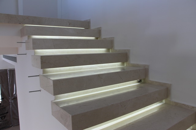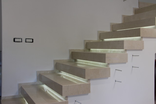 Мы видим нетиповой проект интерьерной лестницы в загородном доме. Проект находится в стадии доработки, но основная масса работы уже выполнена. Лестница имеет прямую конструкцию, воплощенную в простом и лаконичном стиле минимализм. Ступени представляют собой цельные прямоугольные блоки, вырезанные из толстомера испанского мрамора Crema Marfil. Массивная ступень заметно экономит время и силы, особенно в сравнении с обычной облицовкой, но в разы утяжеляет всю конструкцию и повышает стоимость проекта. Однако Вы можете быть уверены в долголетии такой лестницы - цельные каменные ступени, не истираясь, служат многие столетия.