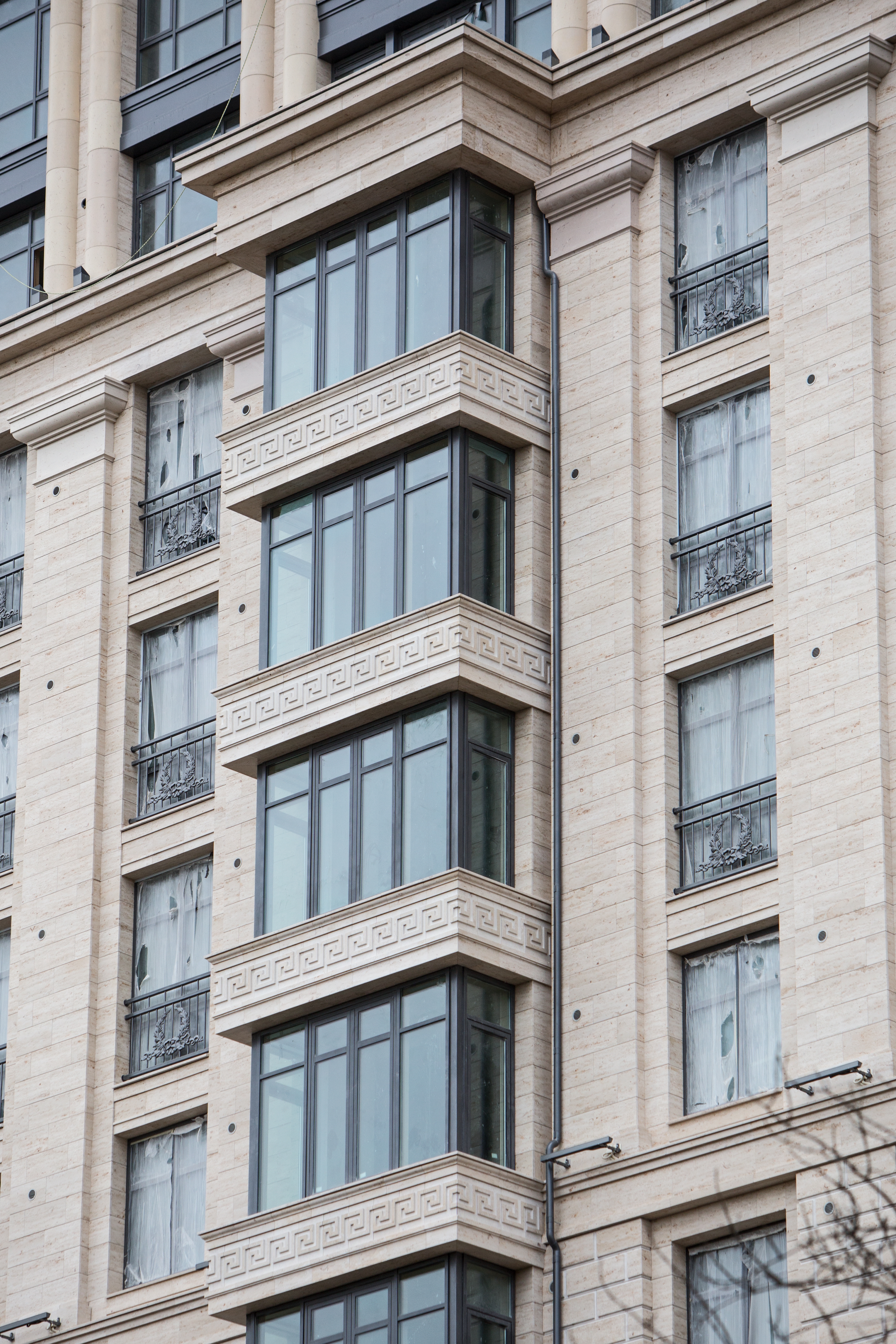 Рассматриваем проект фасадного декора жилого комплекса премиум-класса. И декор, и базовая отделка - все выполнено из бежевого юрского камня с выраженной полосчатостью Jura Rahmweis.