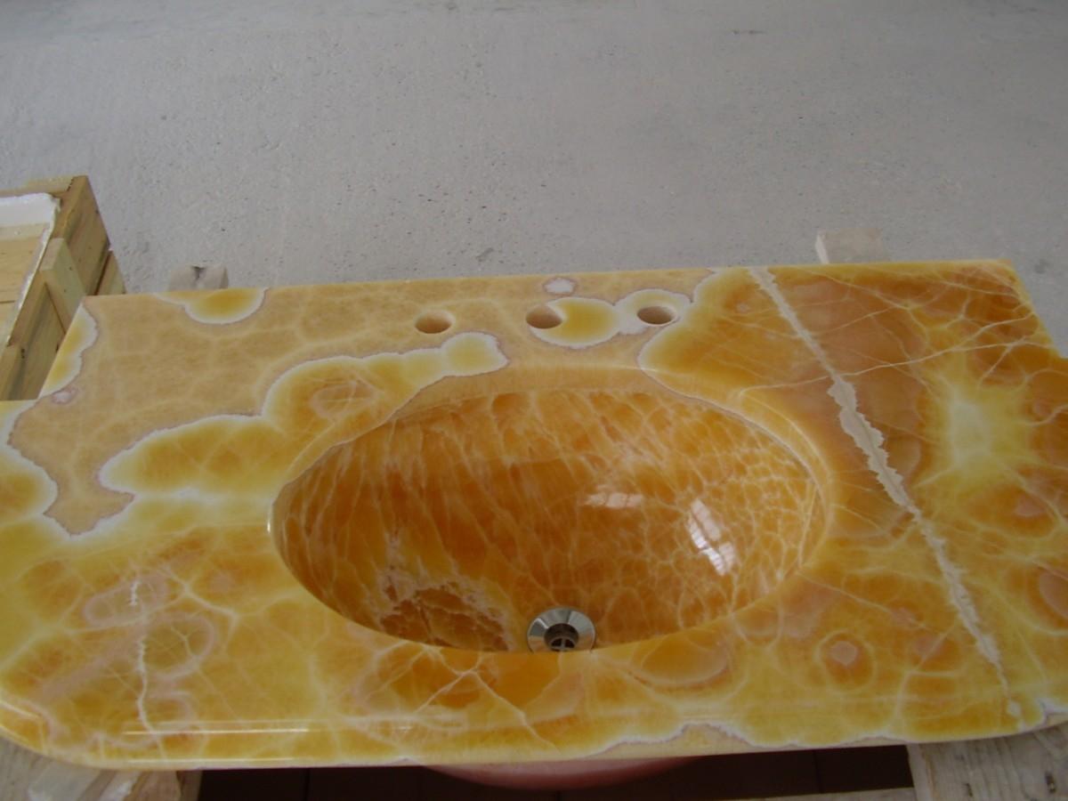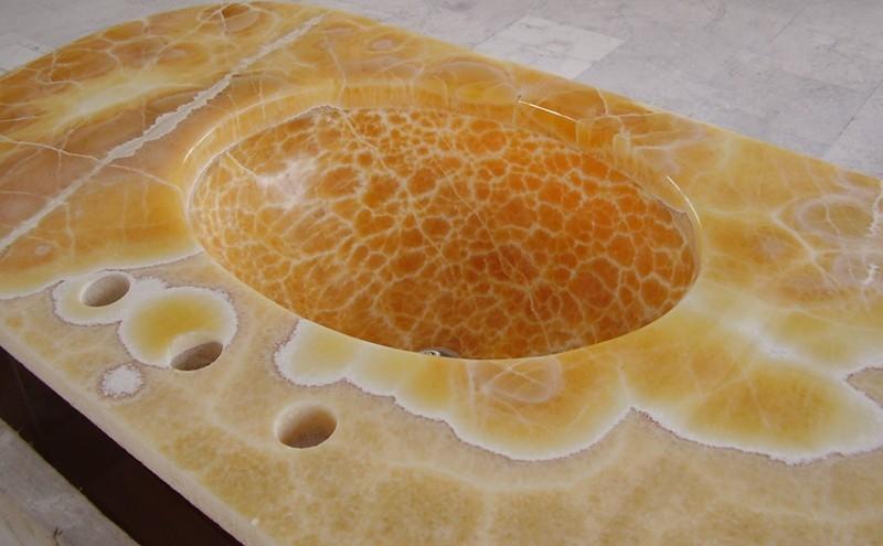 Это изделие состоит из двух частей: столешницы и раковины, которые были склеены на завершающем этапе. Раковина вырезана из единого блока мраморного оникса Miele. При помощи 3D программы станок вырезал абсолютно уникальное изделие, разработанное архитектором по единичному проекту. Далее мастер вручную довел изделие до совершенства - ручным инструментом и абразивами.