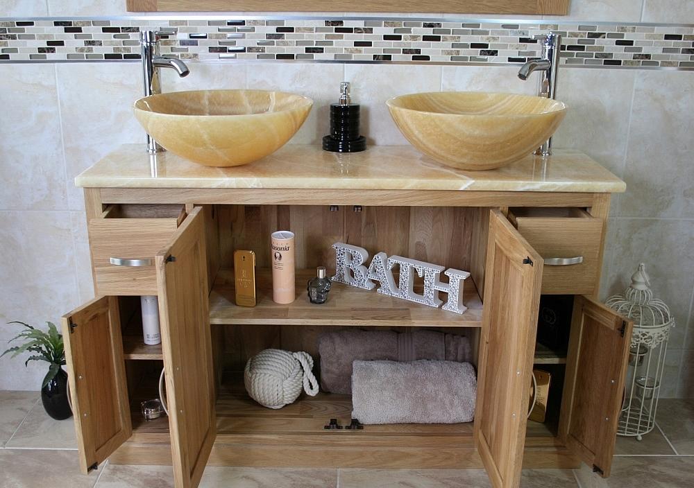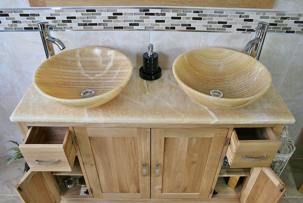 Столешница и установленные на ней мойки выполнены из желтого мраморного оникса Onyx Miele.