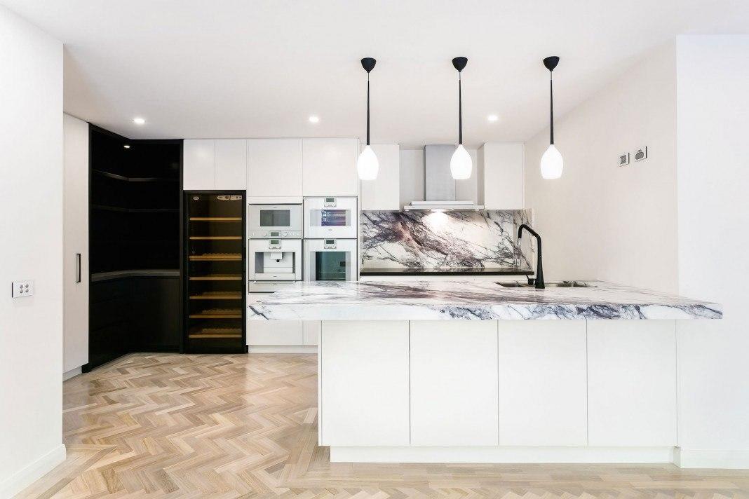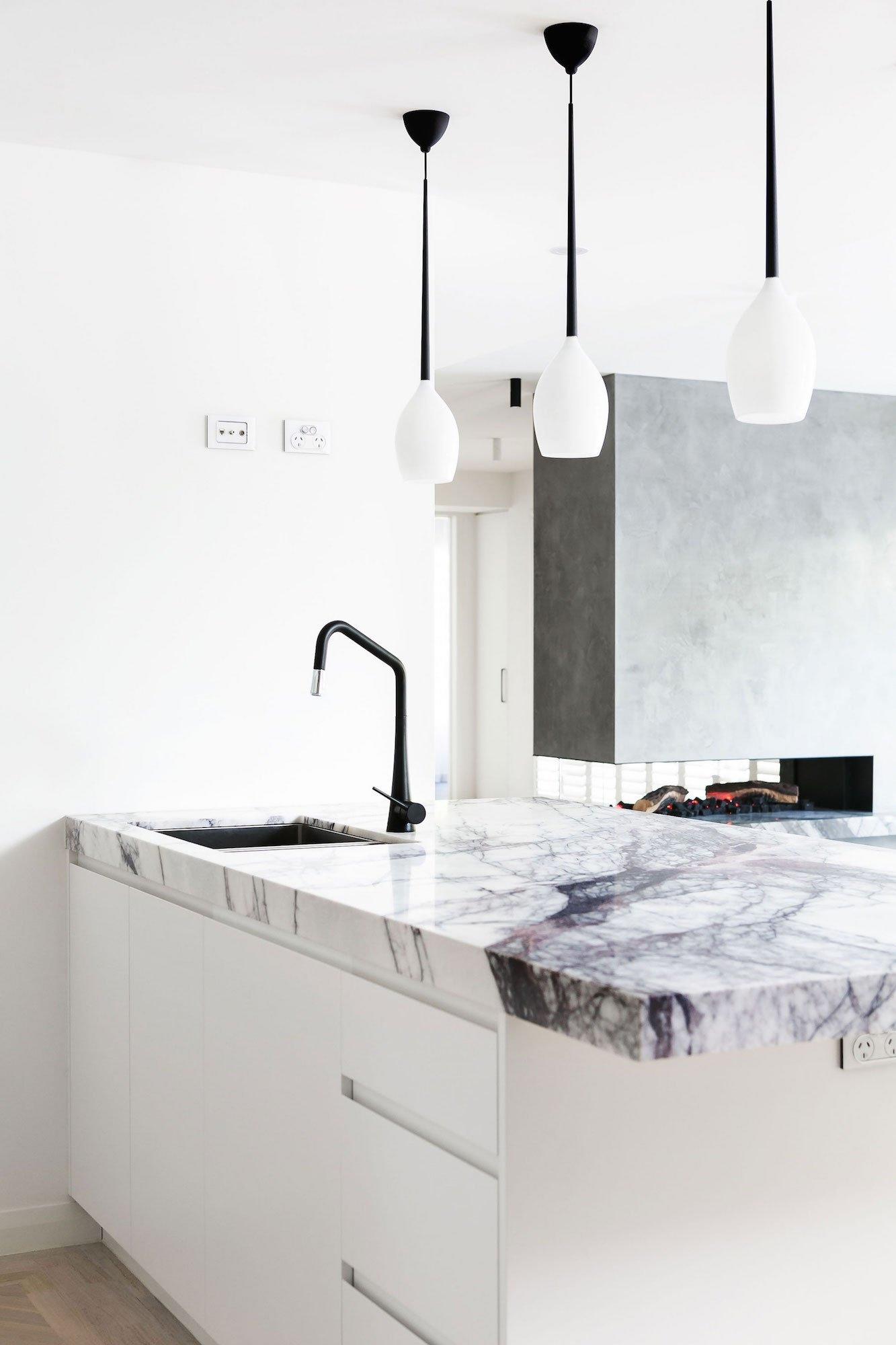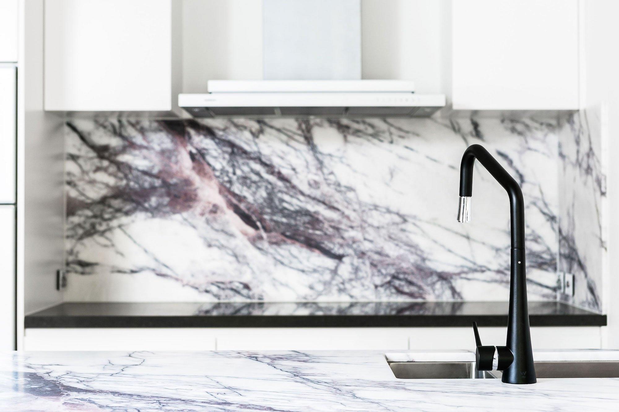 В данном проекте этот мрамор задействован в виде фартука в рабочей зоне и столешницы для кухонного острова.