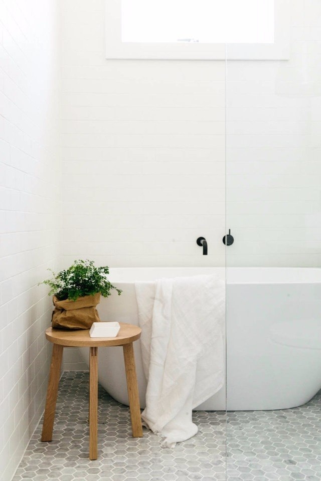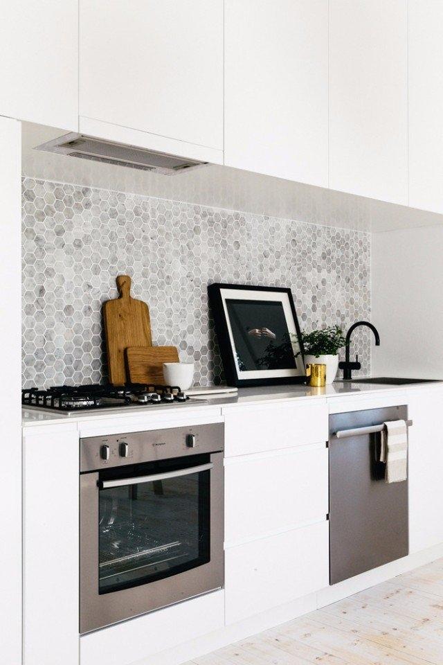 Легендарный мрамор Bianco Carrara завершает интерьерную композицию, придает элегантности. Этот благородный камень использован для облицовки пола в ванной комнате и для отделки фартука, обрамляющего кухонную рабочую зону. Камень представлен однотонной мозаикой в форме сот.