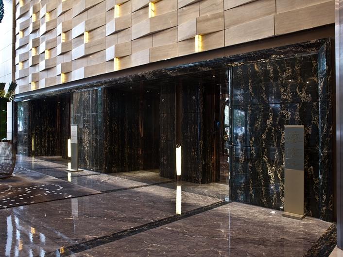 Входная группа и весь цокольный этаж отеля облицованы полированным мрамором Nero Portoro. Роскошный черный мрамор с золотыми прожилками лучше любых слов говорит о респектабельности заведения. Неспроста Nero Portoro — один из самых дорогих сортов мрамора в мире. Этот камень не часто встречается в отделке, особенно уличной.