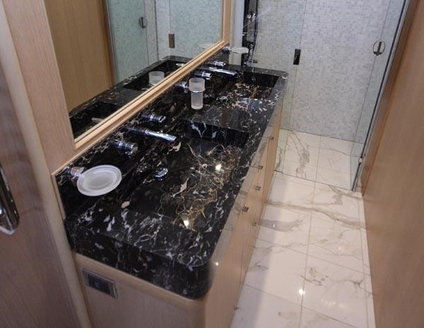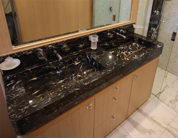 Из этого мрамора выполнена массивная столешница, объединенная с мойками. Изделие собрано методом склейки множества элементов, но визуально оно производит впечатление вырезанного из единого каменного монолита.