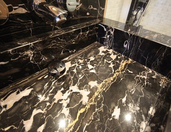 Оригинальный мрамор Nero Portoro - один из самых дорогих сортов камня в мире (хотя есть и китайский аналог камня - Black and Gold - он гораздо бюджетнее). В любом случае, этот камень, как ни один другой, претендует на звание самого торжественного и статусного мрамора среди себе подобных. Золотые жилы и белые прожилки покрывают абсолютно черную массу, создавая непередаваемую игру света на поверхности камня.