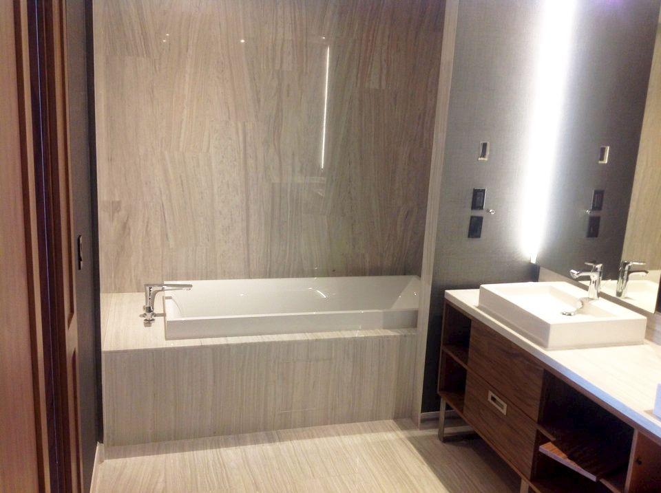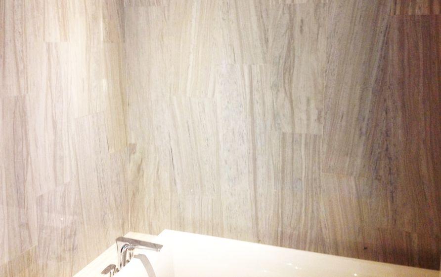 Перед нами лаконичный и элегантный интерьер ванной комнаты в отеле. Дизайнер проекта по достоинству оценил греческий мрамор Nestos - полосчатый камень в нежной серо-бежевой гамме. Именно он является единственным украшением проекта.
