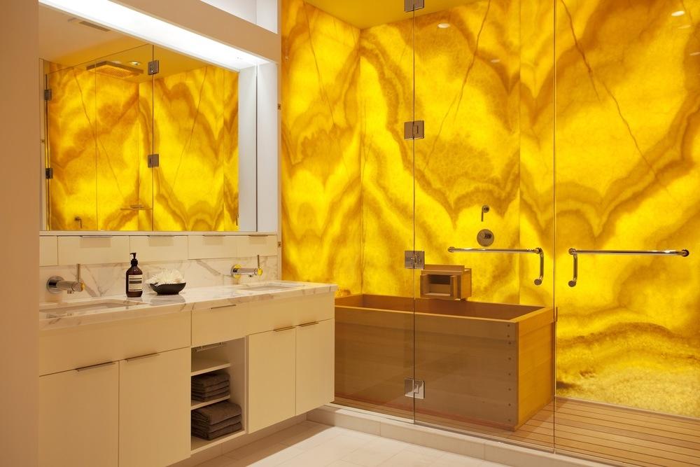 Для отделки ванной комнаты дизайнер решил использовать продолговатые слэбы мраморного оникса Onyx Arco Iris. Слэбы сложены таким образом, что образовался симметричный рисунок. Такая раскладка носит название "бабочка", она требует прямого заказа каменного материала с месторождения - слэбов, распиленных от единого блока породы.