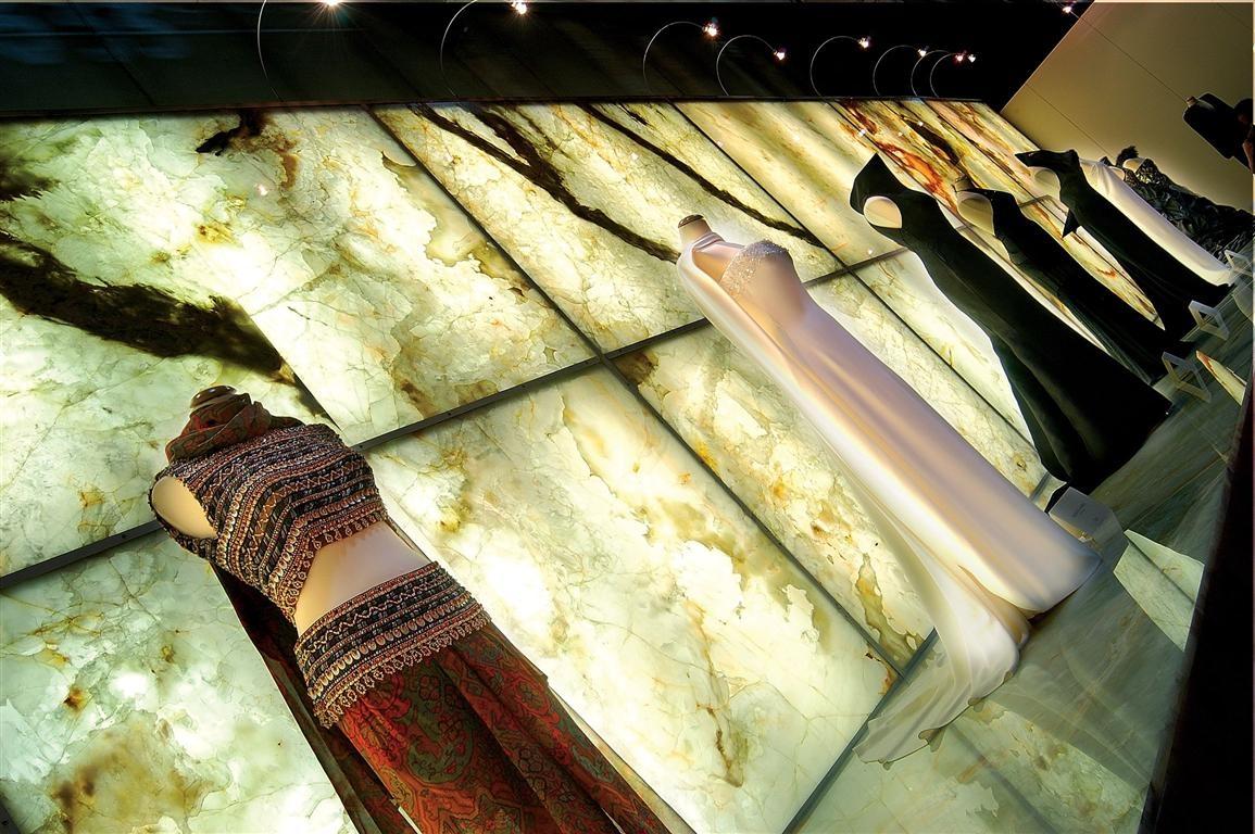 Стена шоурума отделана крупными плитами мраморного оникса Bianco. Плиты крепятся на металлическую каркасную конструкцию. Из этого же оникса выполнен идущий вдоль стены постамент, предназначенный для стоящих манекенов.