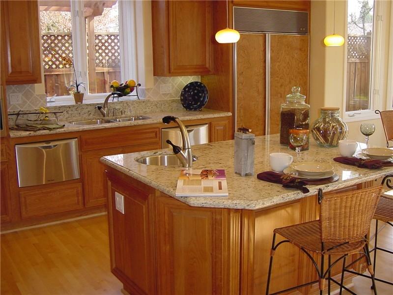 В отделке этой кухни использовался гранит Giallo Ornamentale - золотисто-бежевый, зернистый, с однородной структурой. Этот камень естественно дополняет интерьер с преобладанием желтой древесины.