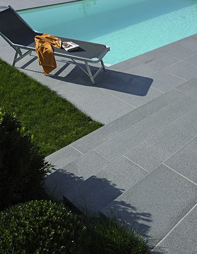 Плиты китайского гранита Padang Dark использованы для отделки пространства вокруг загородного дома. Ими облицована небольшая терраса, площадь вокруг бассейна, ландшафтная лестница в четыре ступени.