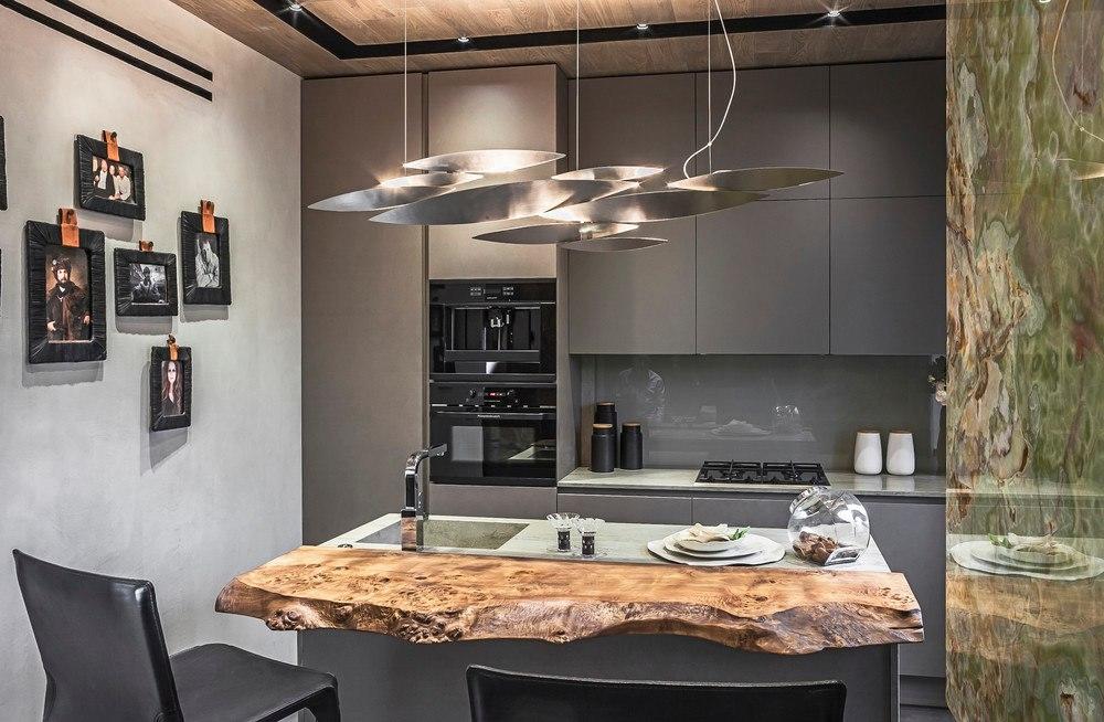 Перед нами проект стильной и оригинальной кухни, который вмещает в себя разнообразные стилистические решения. Здесь и первобытность стиля кантри, и лаконичность хай-тека, и замысловатость ар-деко, и природность эко-стиля.. Творческий союз дизайнера и заказчика породил интересный и запоминающийся интерьер - смелый и самобытный, с выраженным мужским характером.