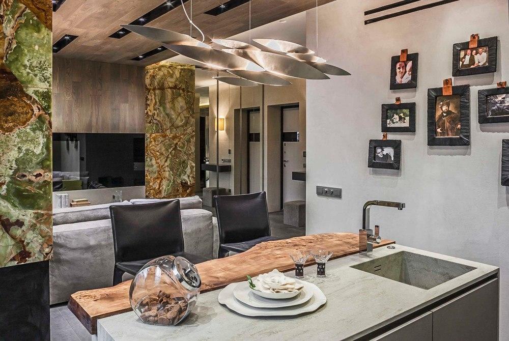 Интерьерные колонны визуально зонируют пространство, разделяя кухню и гостиную. Верхняя часть колонн облицована живописным мраморным ониксом Pakistan Green. Для проекта были задействованы крупные плиты с полированной поверхностью.