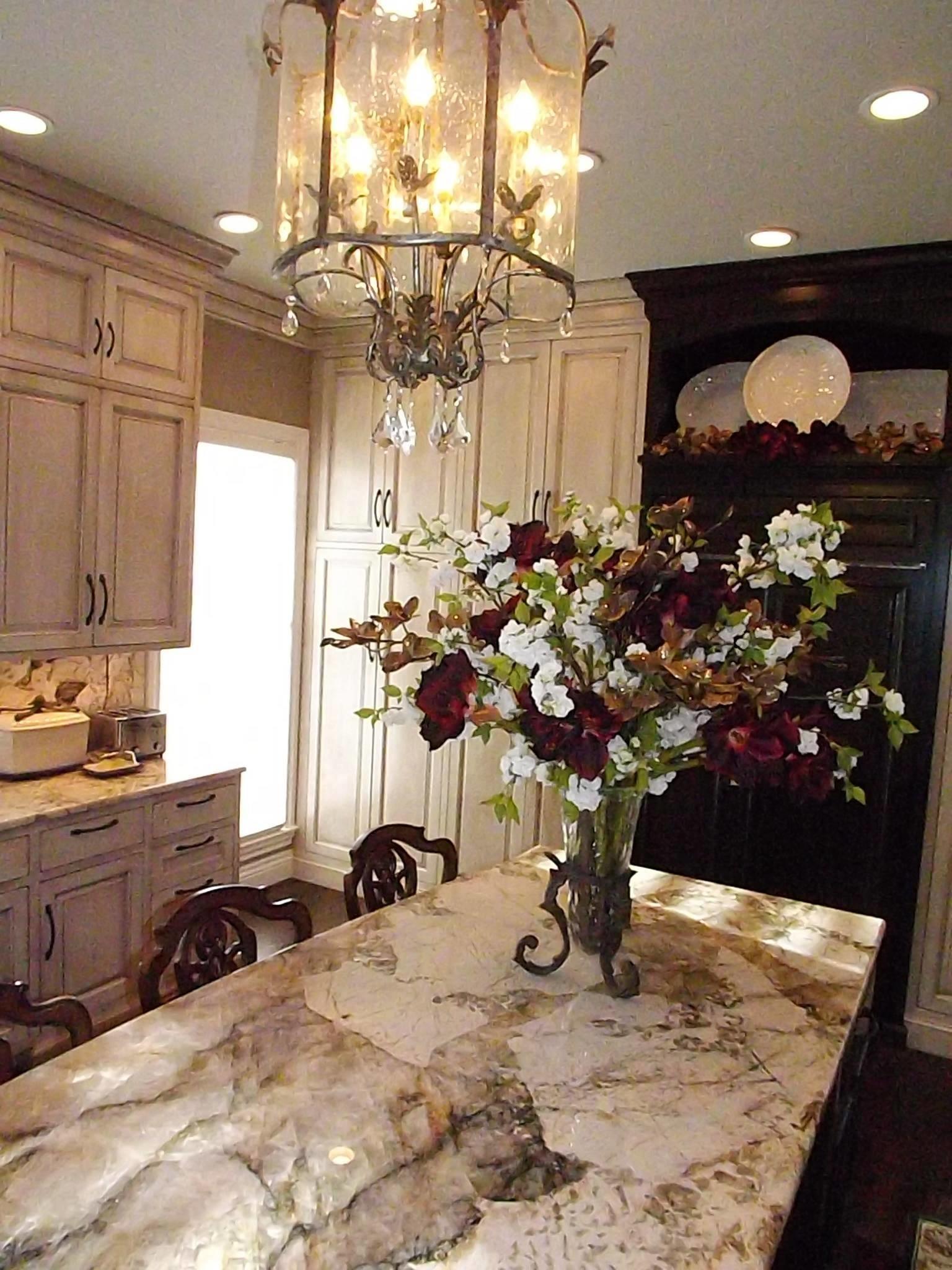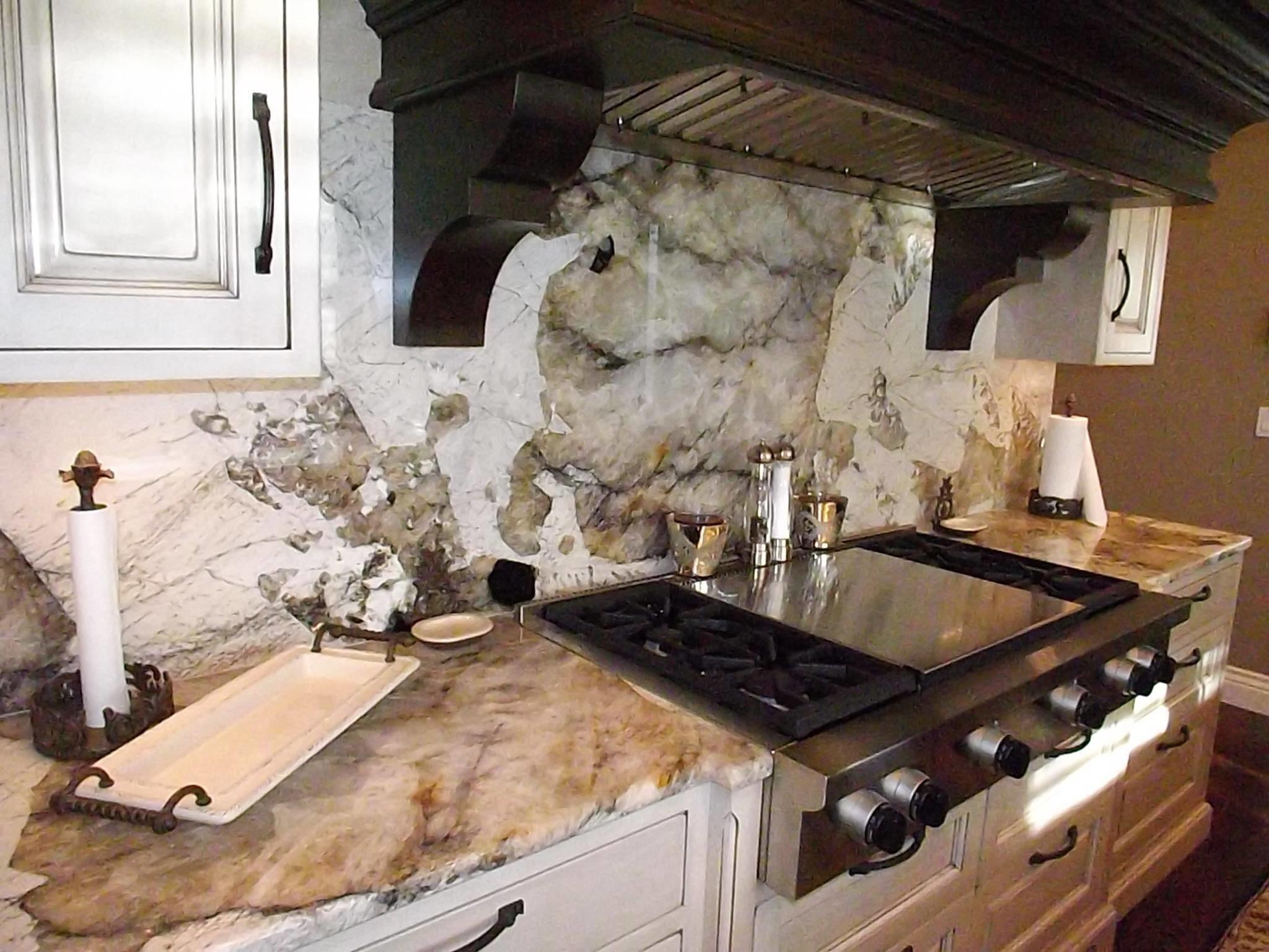 Заказчики знали об этих свойствах камня и выбрали его не за одну лишь красоту. Кварцитом Patagonia покрыты рабочие поверхности гарнитура и столешница стола-острова. Также им облицована зона фартука.