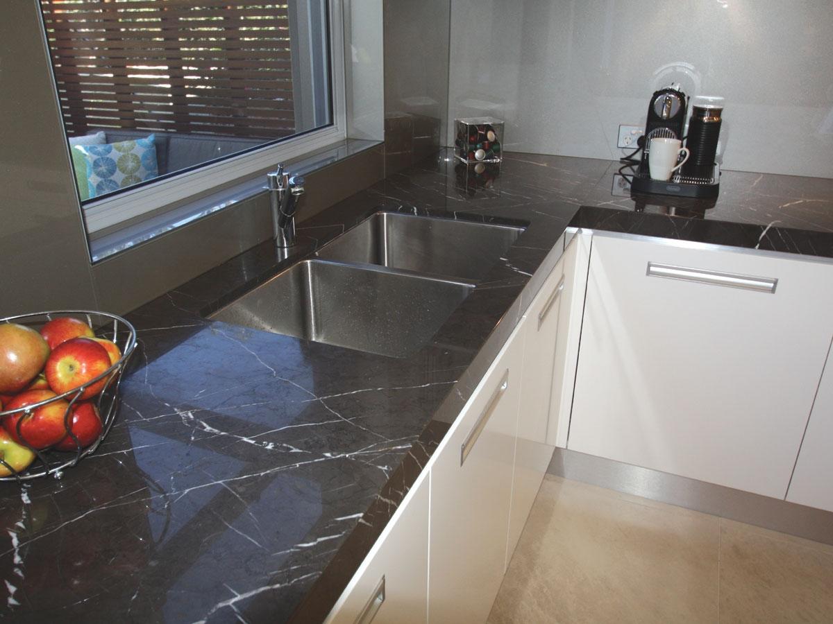Для проекта были заказаны 3-сантиметровые слэбы полированного мрамора. Укрепление торцов производилось при помощи подклейки полос. Это придало всему проекту более фундаментальный и добротный вид.
