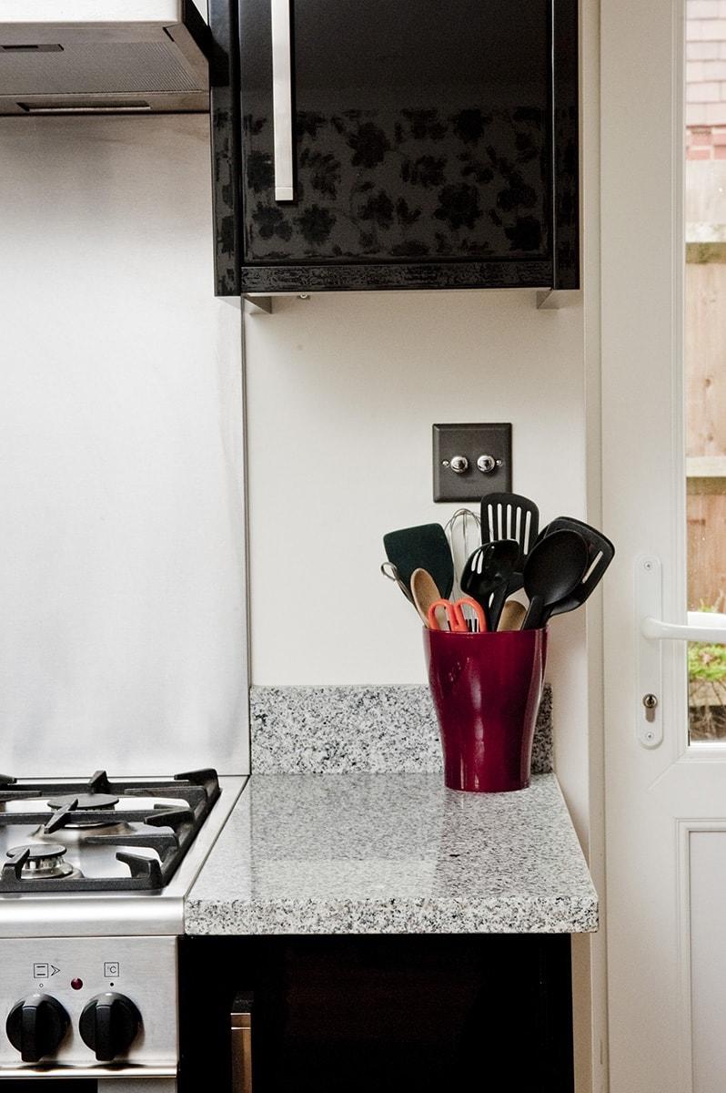 Перед нами проект стильной кухни в загородном доме. Все столешницы выполнены из светлого зернистого гранита Platinum White. Для него характерна однородная текстура с частым узором темных мелких зернышек. Этот материал подойдет для проекта любой стилистической направленности. Что не менее важно, Platinum White достойно выдерживает довольно агрессивные условия кухонной среды: механическую нагрузку, повышенную влажность, контакт с бытовыми кислотами.