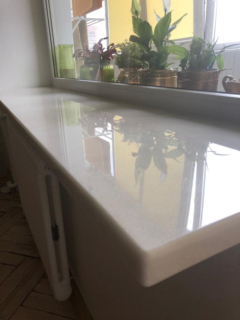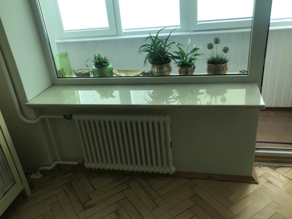 Изготовление и монтаж подоконника из белого Полоцкого мрамора для частного клиента в Санкт-Петербурге.