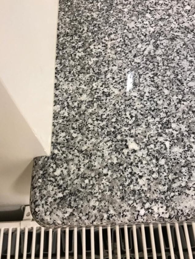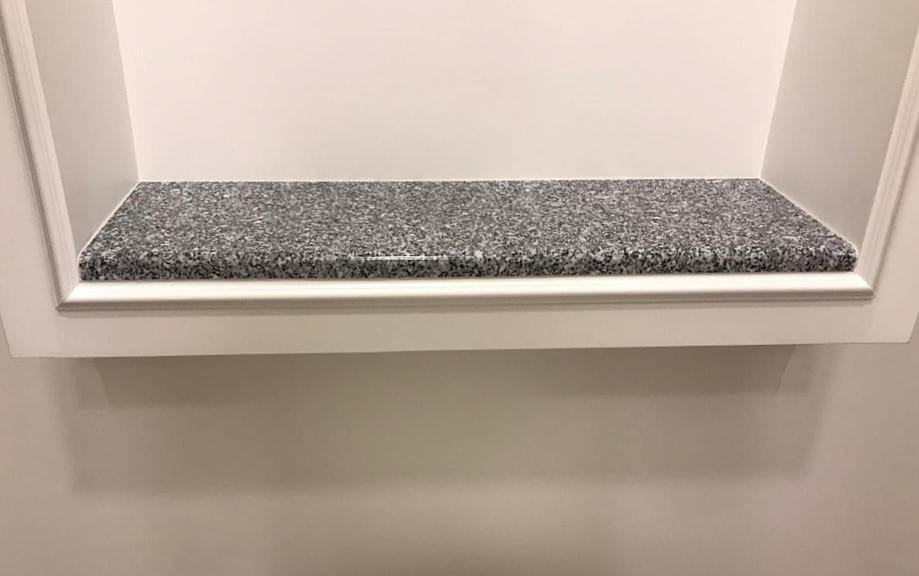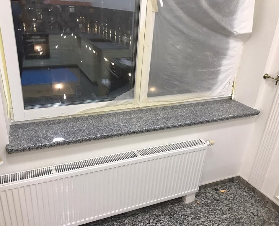 Изготовление и монтаж двух подоконников и большой угловой столешниц из серого гранита Bella White. Из обрезков камня по просьбе клиента была так-же сделана маленькая полочка для ванной комнаты.